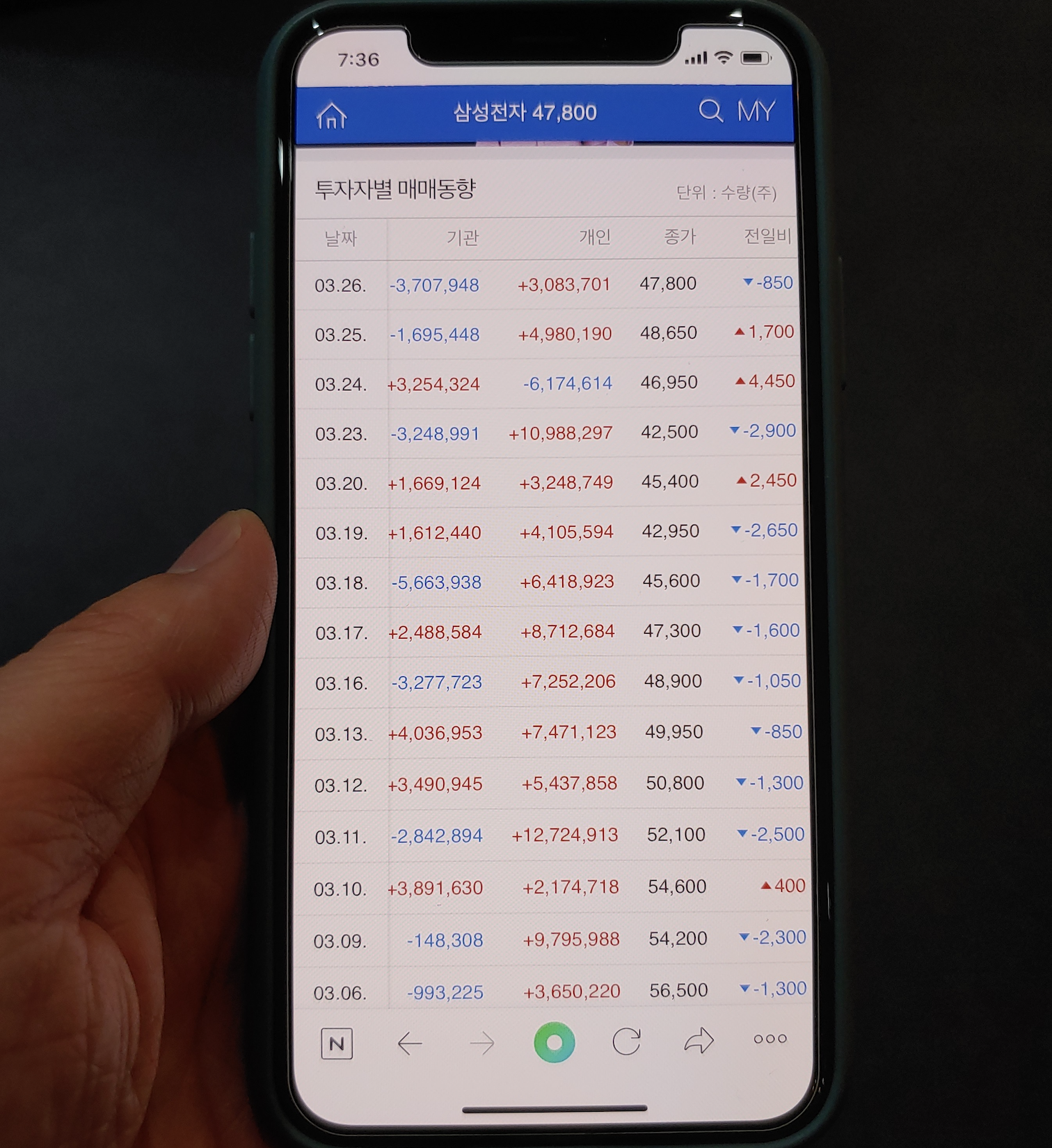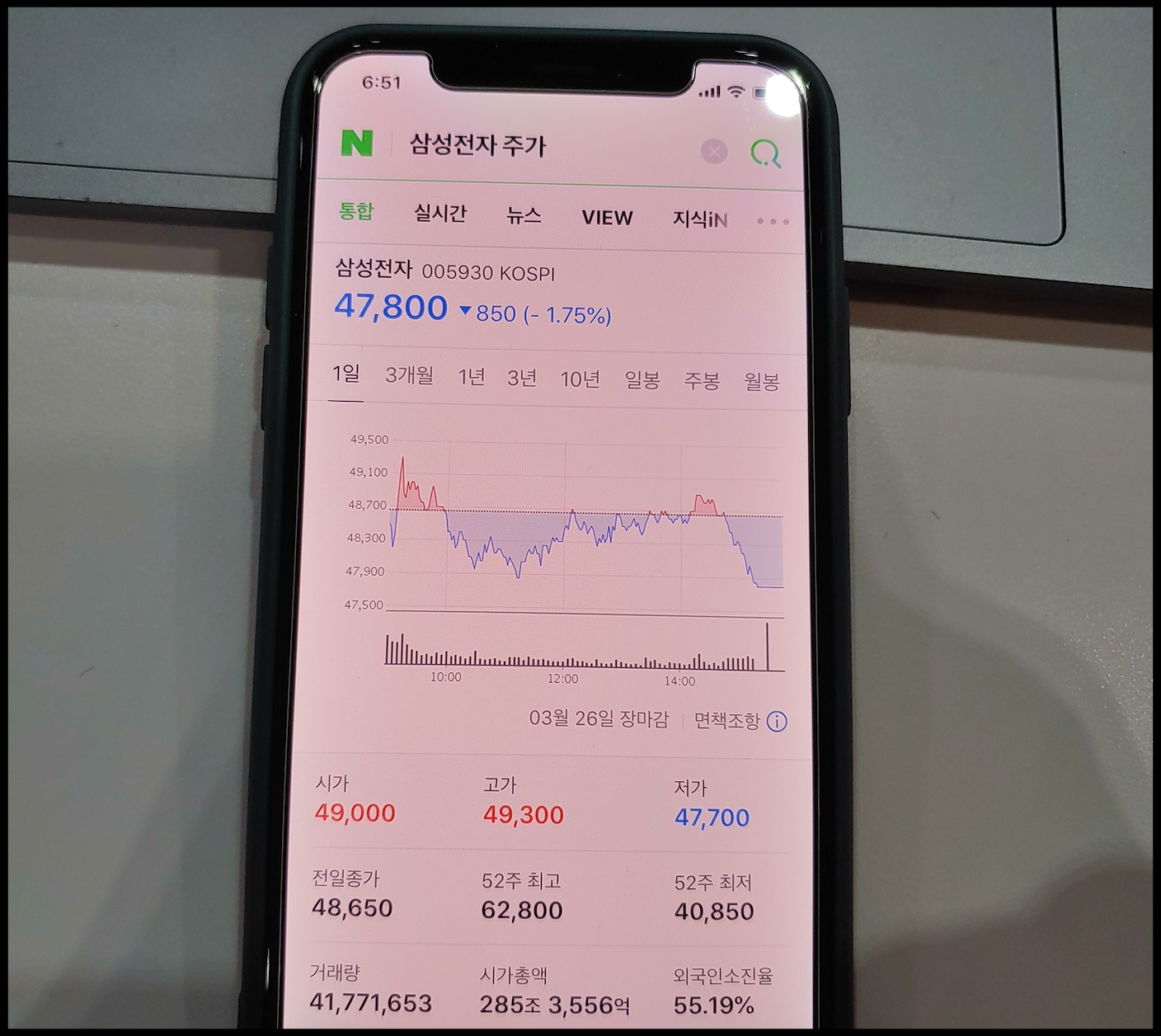 [사진 = 삼성전자 주가 3월 26일 47,800원 기록했습니다. 전날에 비해 850원 떨어진 -1.75% 기록했습니다. 이날 오전에 49,300원까지 올랐으나 끝내 47,700원으로 떨어지면서 장을 마쳤습니다. 삼성전자 주가 오전에 계속 오르다 보니 기관에서 물량을 많이 팔았습니다. 최근 삼성전자 주가 살펴보면 하락장에서 외인들의 매도가 두드러졌는데 3월 26일은 외국인들이 주식을 사들이는 분위기였다면 개인 투자자들의 매수세는 여전히 강했습니다. 삼성전자 주가 구입할 수 있는 기회로 여겨졌기 때문입니다. (C) 네이버 앱]