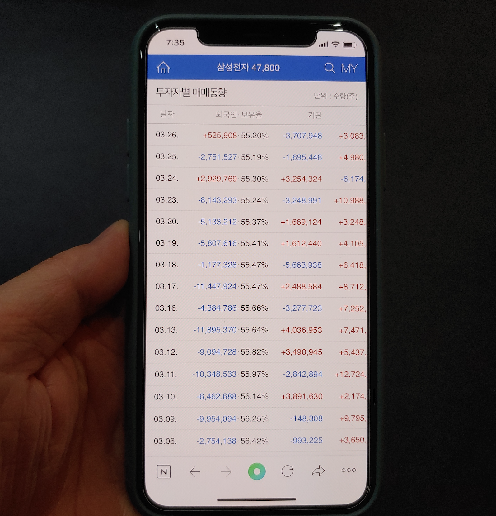 [사진 = 삼성전자 주가 투자자별 매매동향 살펴보면 외국인들의 매도세가 얼마나 강했는지 알 수 있습니다. 3월 6일부터 3월 26일까지를 기준으로 놓고 보면 3월 24일, 3월 26일 이틀을 제외한 나머지 날은 완전히 매도였습니다. 거의 파란색으로 도배될 정도였습니다. 그러면서 삼성전자 외국인 보유율 56.42%에서 55.20%로 하락했습니다. (C) 네이버 앱]