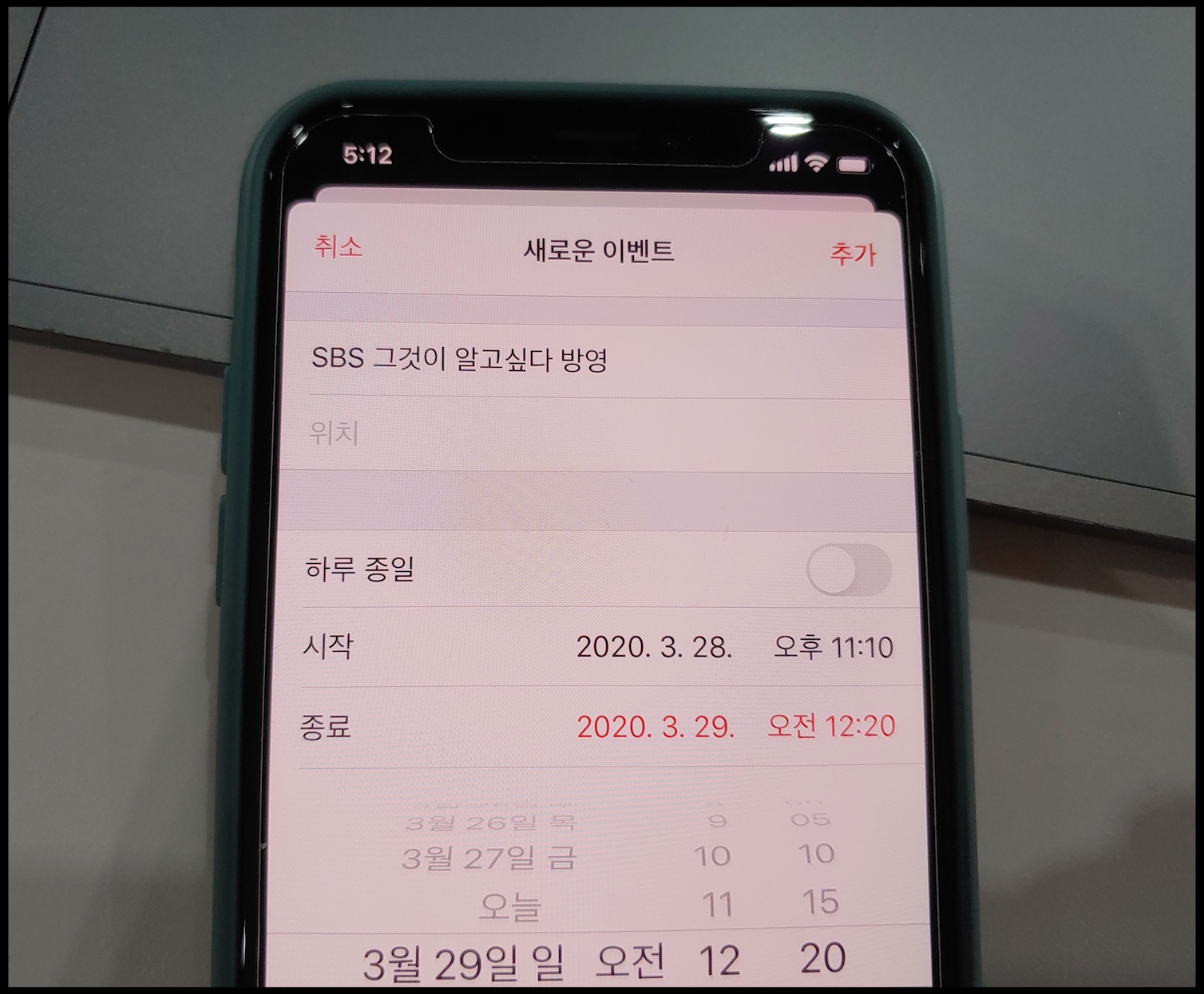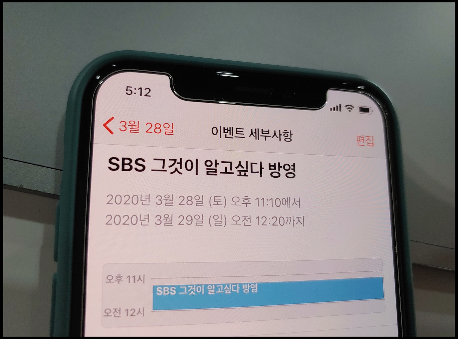 [사진 = 2020년 3월 28일 SBS 그것이 알고싶다 방영됩니다. 사진은 저의 스마트폰 달력이며 2020년 3월 28일을 가리킵니다. (C) 나이스블루]