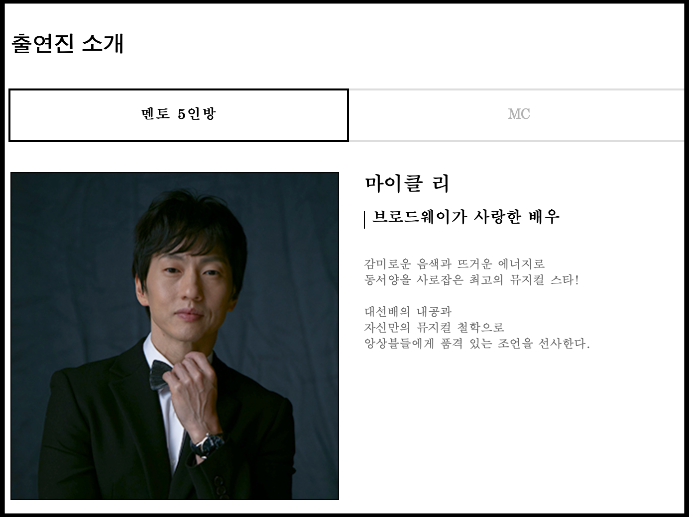 [사진 = 마이클리 tvN 더블 캐스팅에서 멘토로 출연중입니다. 이 프로그램은 한국 최초의 뮤지컬 앙상블 서바이벌입니다. 마이클리가 멘토로 나온다는 것은 한국 뮤지컬 계에서 엄청난 커리어를 지닌 인물임을 알 수 있습니다. 미국 브로드웨이에서 맹활약 했던 배우였으니 말입니다. (C) tvN 더블 캐스팅 공식 홈페이지 프로필 사진]