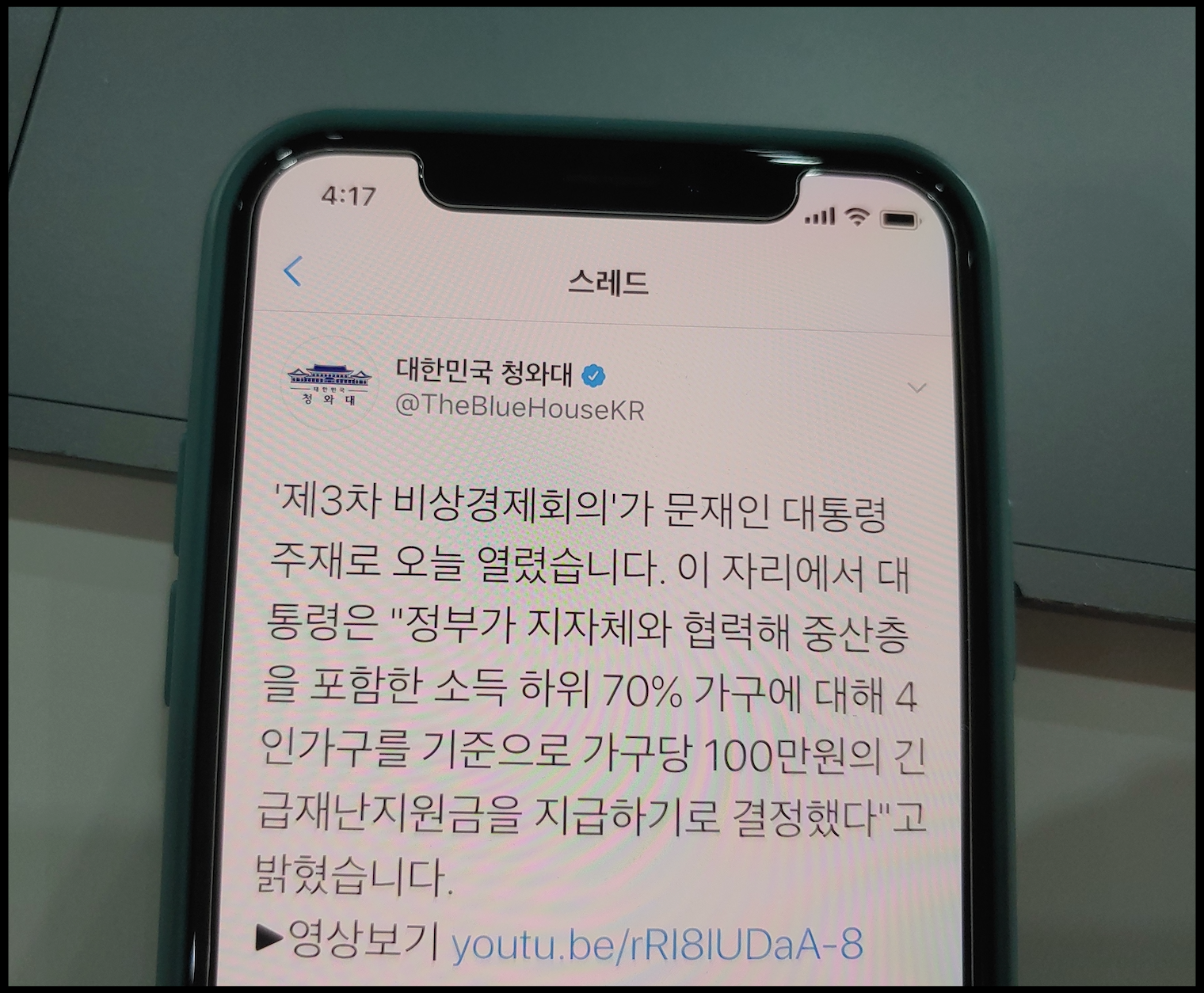 [사진 = 대한민국 청와대 공식 트위터에서는 정부의 소득하위70% 기준 긴급재난지원금 관련 게시물을 올렸습니다. (C) 대한민국 청와대 공식 트위터]