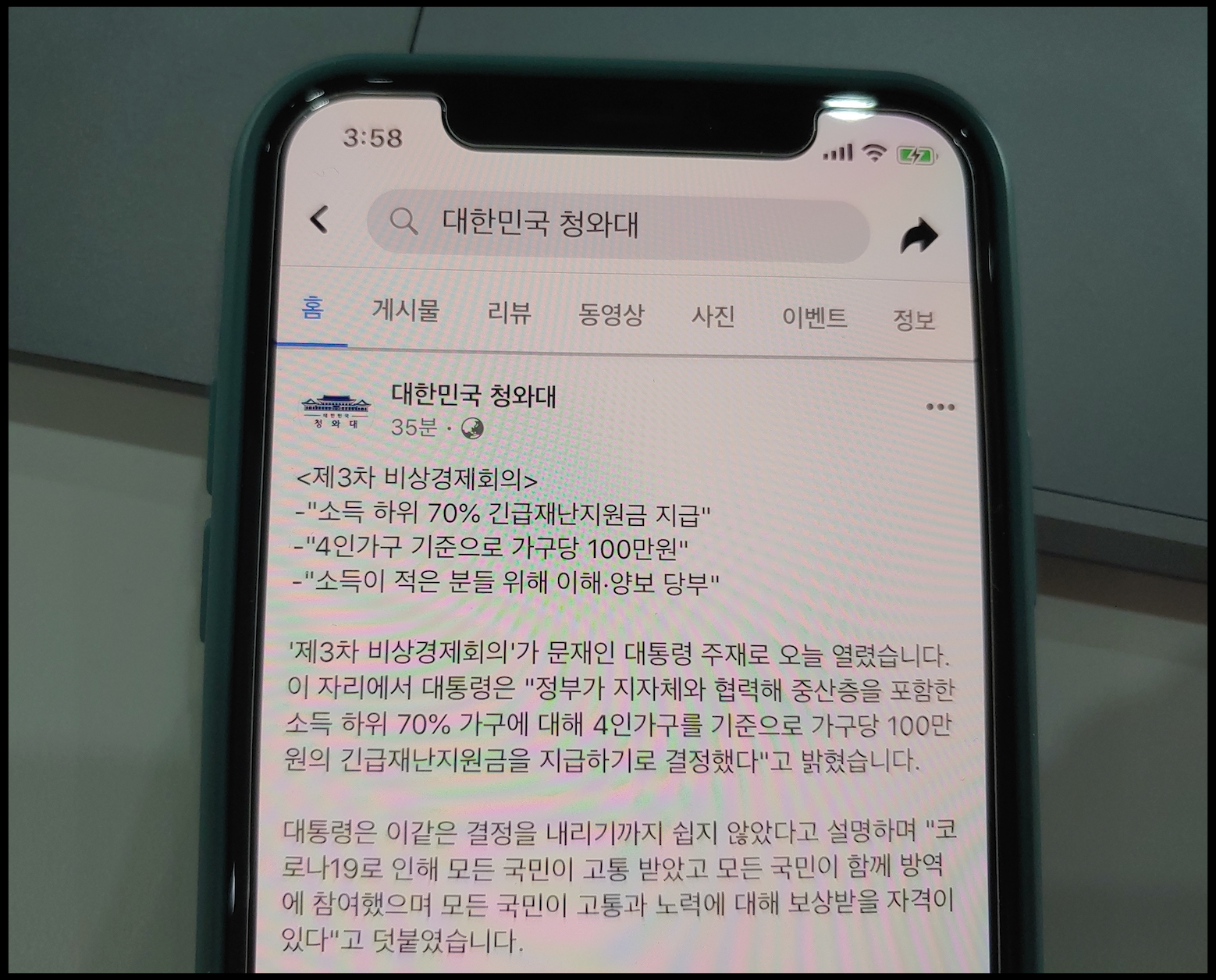 [사진 = 대한민국 청와대 공식 페이스북에서는 제3차 비상경제회의 관련 게시물을 올렸습니다. 소득 하위 70% 기준 긴급재난지원금 지급을 결정했으며 4인 가구 기준으로 가구당 100만원 돌아간다고 밝혔습니다. 문재인 대통령은 이런 결정을 내리기 쉽지 않았다고 했으며 모든 국민이 고통 및 노력에 대한 보상을 받을 자격 있다는 언급을 했습니다. (C) 대한민국 청와대 공식 페이스북]