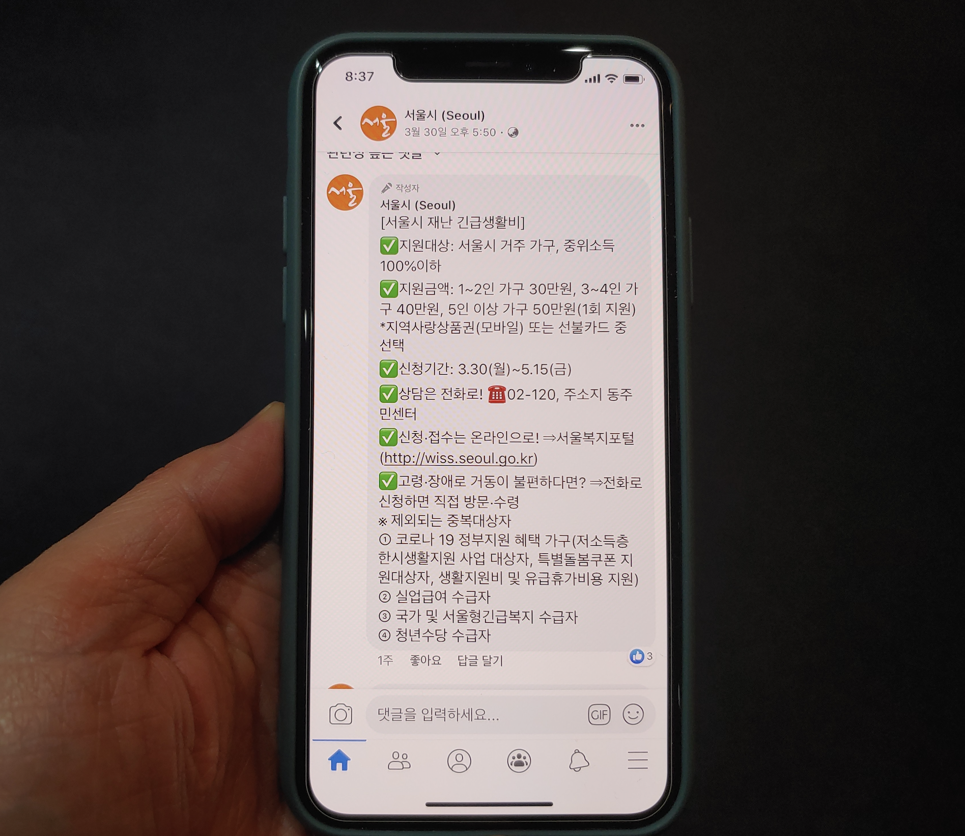 [사진 = 서울시 페이스북에서는 최근 서울시 재난긴급생활비 알리는 게시물을 올렸습니다. 지원대상은 서울시 거주 가구이며 중위소득 100%여야 합니다. 지원금액은 1~2인 가구 30만 원, 3~4인 가구 40만 원, 5~6인 가구 50만 원(1회 지원)입니다. 지역사랑상품권(모바일) 또는 선불카드 중에서 선택할 수 있는데 여기서 지역사랑상품권이 서울사랑상품권 입니다. (C) 서울시 페이스북]