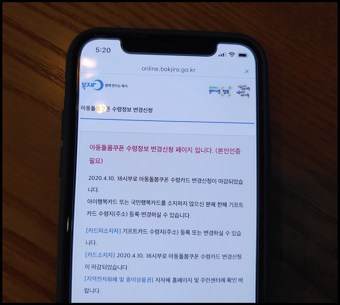 [사진 = 복지로 홈페이지에서는 아동돌봄쿠폰 수령정보 변경 신청이 끝났다고 안내됐습니다. 현재는 아이행복카드 또는 국민행복카드 소지하지 않은 분에 한해서 기프트카드 수령지(주소) 등록 및 변경 가능하다고 합니다. (C) 복지로 홈페이지]