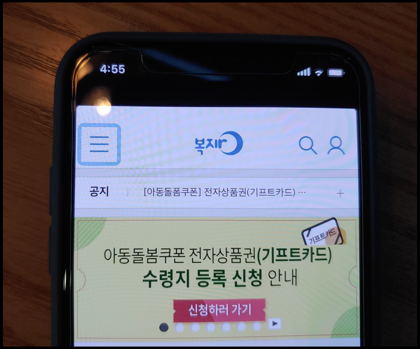 [사진 = 보건복지부가 운영하는 복지포털 사이트 복지로 앱 메인에서는 아동돌봄쿠폰 전자상품권(기프트카드) 수령지 등록 신청에 대하여 전파했습니다. 아동돌봄쿠폰 지원대상은 만 7세 미만 아동이며 2020년 3월 기준으로 아동수당 수급대상자입니다. 이미 전자상품권(돌봄포인트) 카드변경은 종료되었으며 4월 6일부터 별도의 공지가 있을 때까지 전자상품권(기프트카드) 수령지 등록 및 변경 신청 아이행복카드 또는 국민행복카드 소지하지 않은 경우에 한해서 기프트카드 수령지 등록 가능하다고 언급했습니다. (C) 복지로 앱]