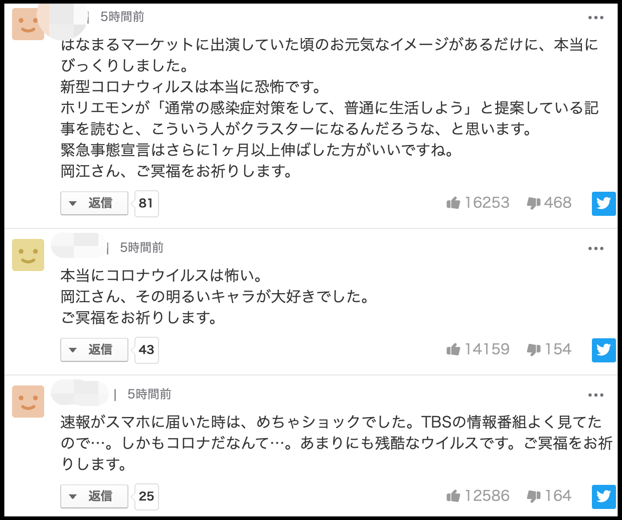 -속보가 스마트폰에 도착했을 때는, 굉장히 쇼크였어요. TBS 정보 프로그램을 자주 봐서...게다가 코로나라니...너무 잔인한 바이러스입니다. 명복을 빕니다.