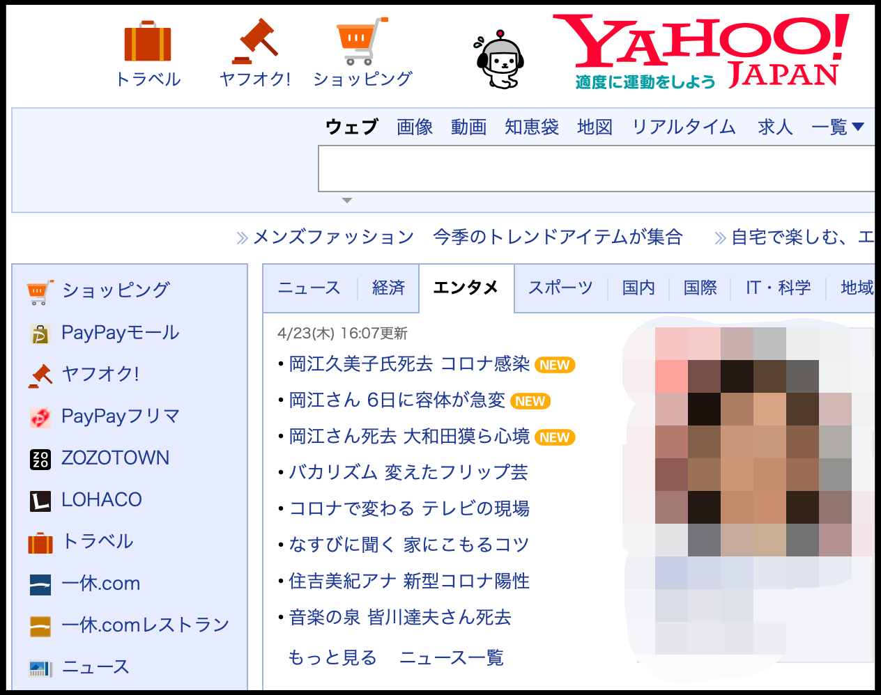 [사진 = 4월 23일 일본 최대의 포털 사이트 야후재팬 실시간 검색어에는 오카에 쿠미코(岡江久美子) 이름이 1위에 올랐습니다. 이날 세상을 떠났다는 소식이 일본인들에게 전해졌기 때문입니다. 13위는 여배우 오카에 쿠미코, 18위는 오카에 쿠미코 코로나 키워드가 떴습니다. 16위는 시무라 켄(志村けん) 이름이 떴습니다. 두 사람은 일본 코로나 확진 사망자이자 유명 연예인이라는 공통점이 있습니다. 그와 더불어 여러 유명인들이 코로나 확진에 시달리는 중입니다. (C) 야후재팬 공식 홈페이지(yahoo.co.jp)]