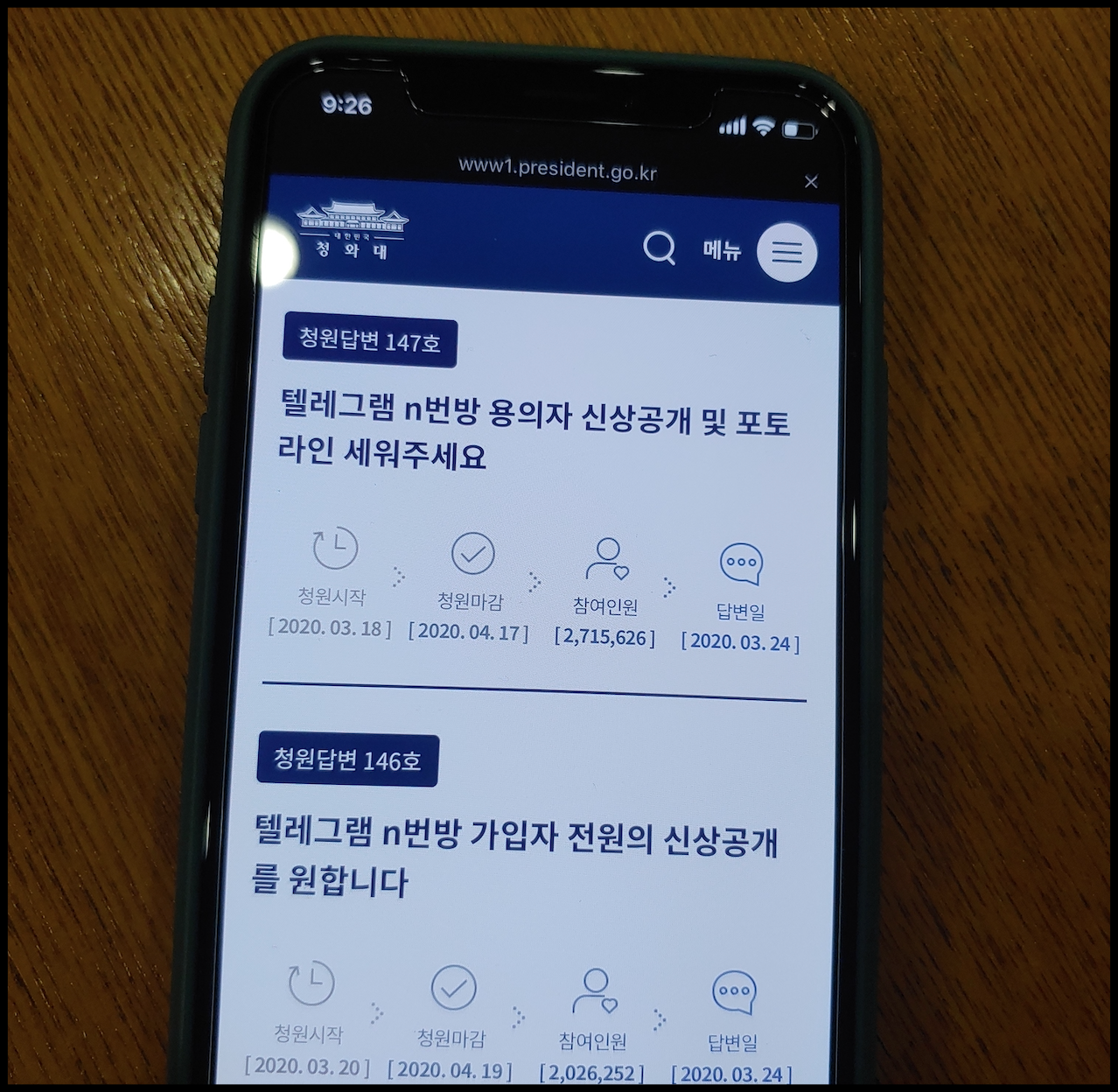 [사진 = 청와대 국민청원 홈페이지에서는 텔레그램 N번방 용의자 신상공개 및 포토라인 세우기, N번방 가입자 전원 신상공개를 원한다는 청원에 각각 271만 명, 202만 명이 참여했습니다. 대한민국 인구 수 5,178만 명임을 떠올리면 엄청난 인원이 청원에 참여했습니다. 박사 조주빈, 부따 강훈, 이기야 이원호에 이어 또 다른 인물이 신상 공개될지 앞으로가 주목됩니다. (C) 청와대 국민청원 홈페이지]