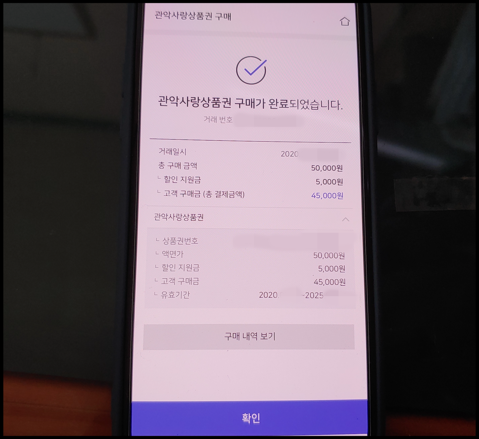드디어 관악사랑상품권 구매 완료했습니다. 5만 원에서 할인된 5천 원은 할인 지원금으로 표시됩니다.