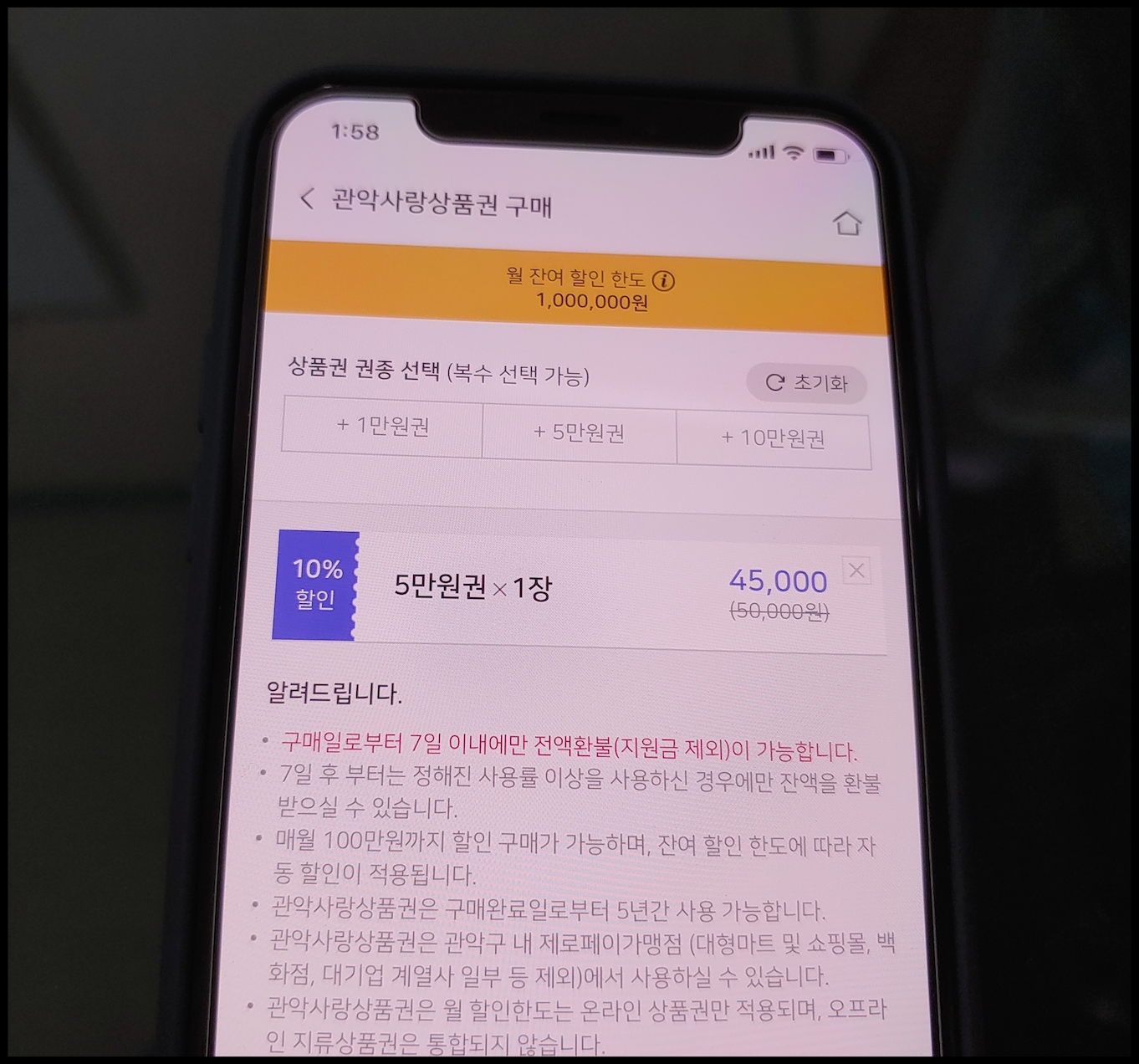 관악사랑상품권 월 잔여 할인 한도는 1,000,000원입니다. 상품권은 1만원권, 5만원권, 10만원권 구입 가능하며 복수 선택할 수 있습니다.
