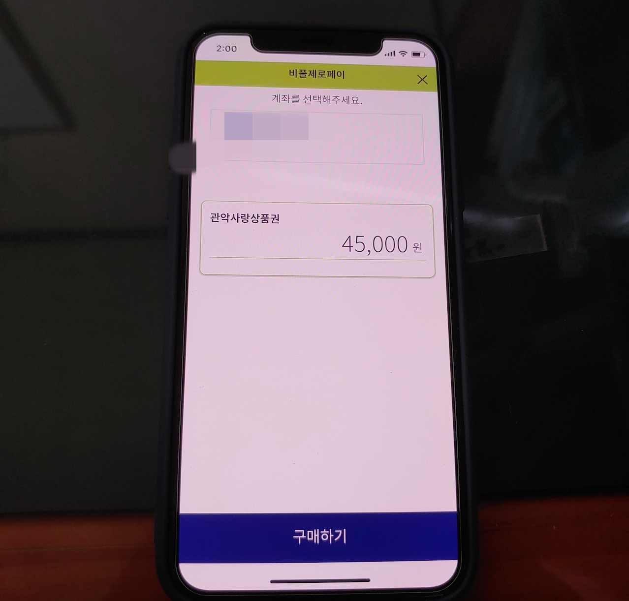 그 이후에는 제가 등록했던 계좌를 선택하면 됩니다. 현재 시점에서 관악사랑상품권 5만원권 구입하는데 45,000원 지출하면 되기 때문에 저의 계좌에서는 45,000원이 빠져나갑니다.