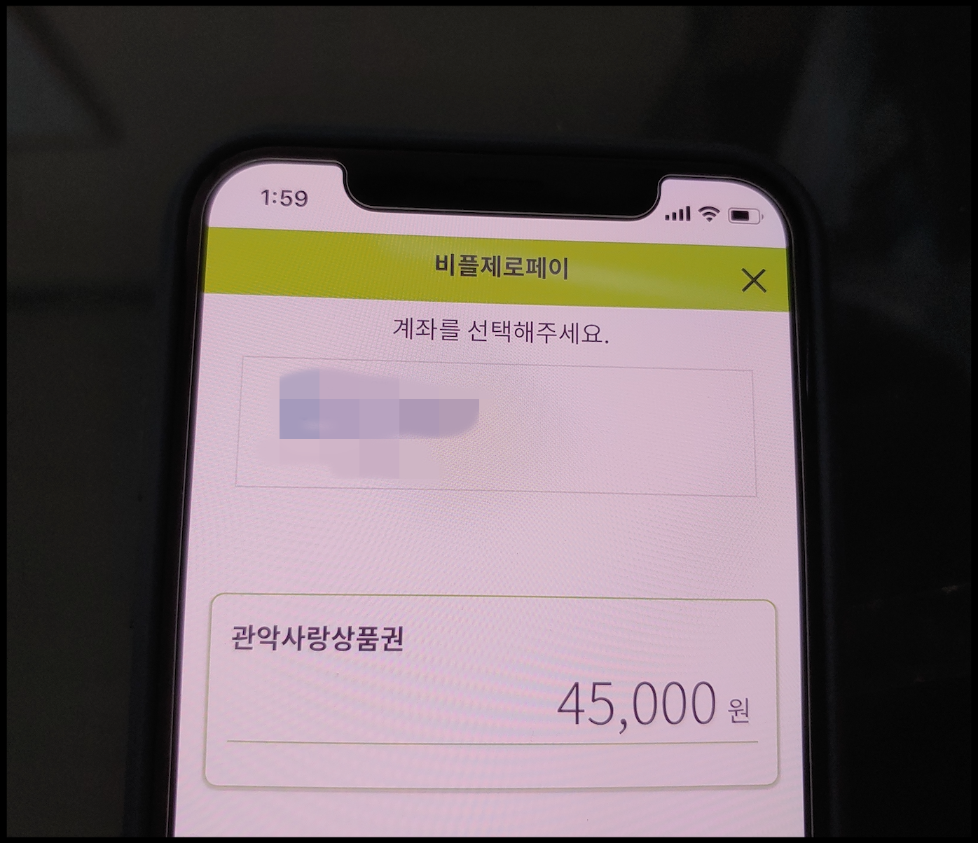 그 이후에는 제가 등록했던 계좌를 선택하면 됩니다. 현재 시점에서 관악사랑상품권 5만원권 구입하는데 45,000원 지출하면 되기 때문에 저의 계좌에서는 45,000원이 빠져나갑니다.