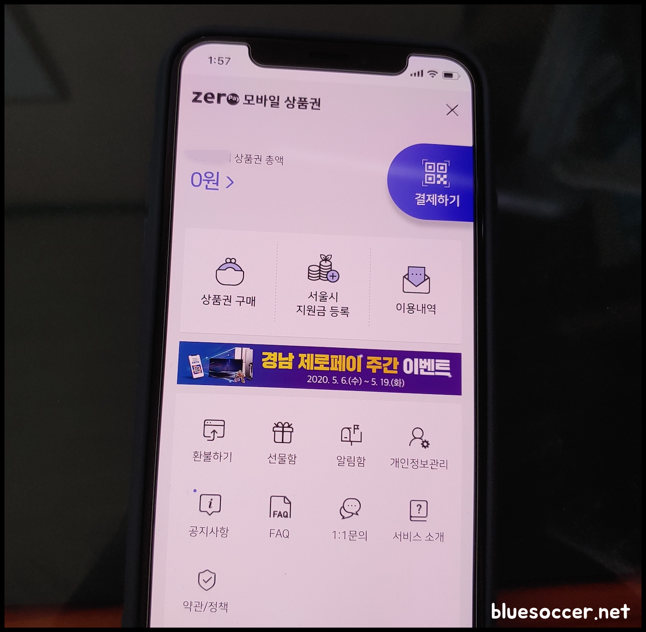 모바일상품권 구입 & 결제 메뉴로 접속하니 저의 상품권 총액이 0원으로 뜹니다. 아직 상품권 구입을 안했기 때문에 0원이 나옵니다. 상품권을 구매하거나 서울시 지원금을 등록하면 금액이 나옵니다.
