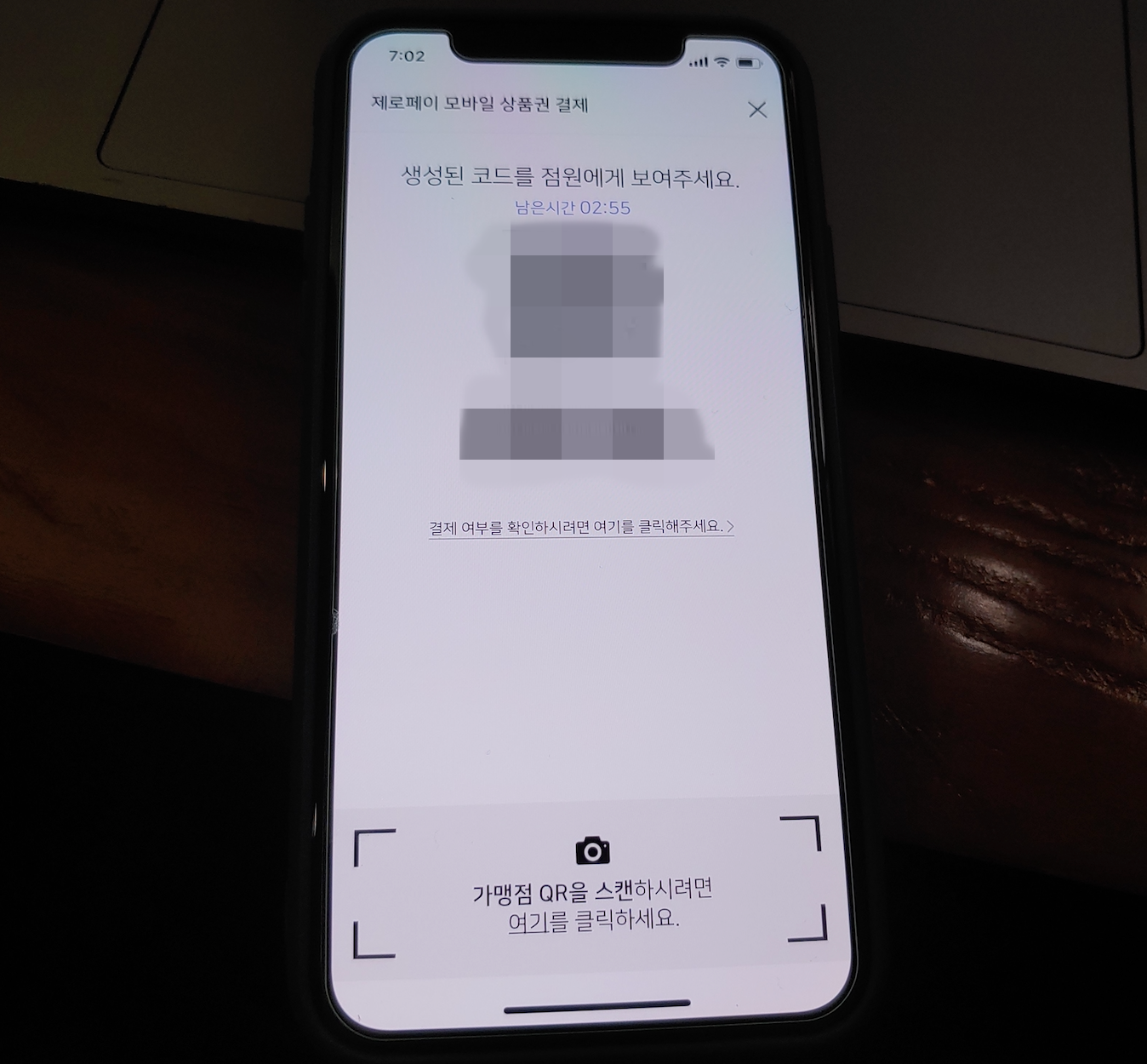 비플제로페이로 결제하면 이러한 화면이 뜹니다. 스마트폰 화면에서 나타나는 코드를 점원에게 보여주시면 됩니다.