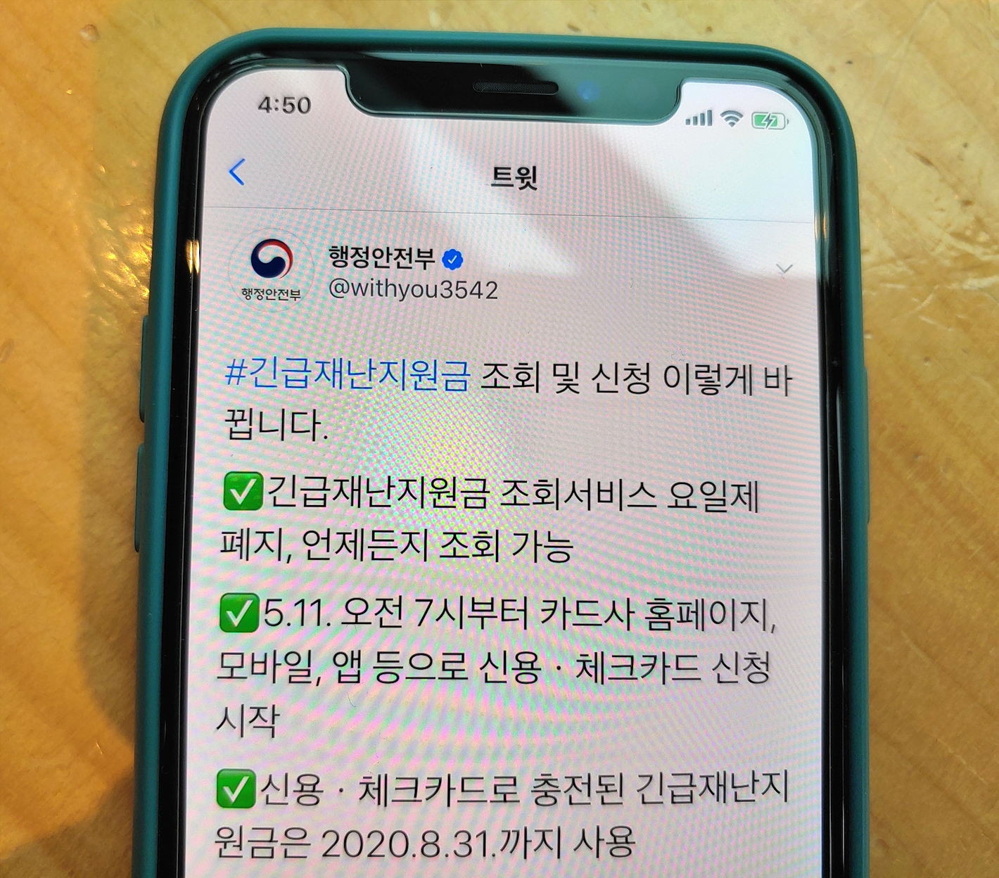 [사진 = 행정안전부 공식 트위터에서는 지난 5월 10일 긴급재난지원금 관련 공지를 올렸습니다. 기존에 긴급재난지원금 조회와 관련하여 요일제를 적용했는데 폐지했다고 합니다. 이제는 요일에 관계없이 조회를 할 수 있습니다.(다만, 조회가 아닌 '신청'은 5부제 유지) 긴급재난지원금 세대주 조회만 가능한 것으로 알려졌습니다. 아울러 11일 오전 7시부터 신용카드 및 체크카드 온라인 신청 가능합니다. 이에 행정안전부 공식 트위터에서는 신용카드 및 체크카드 형태로 충전된 긴급재난지원금 2020년 8월 31일까지 사용해야 한다고 언급했습니다. 내년이나 내후년에 쓸 수 없으며 올해 8월 31일까지 써야 합니다. 8월 31일 이후의 긴급재난지원금 미사용 금액은 국가와 자치단체로 환수 될 예정입니다. (C) 행정안전부 공식 트위터]