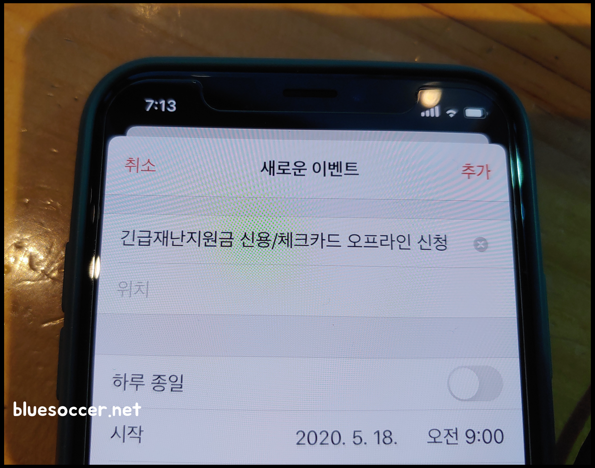 [사진 = 5월 18일 오전 9시부터 긴급재난지원금 신용카드 및 체크카드 오프라인 신청 가능합니다. 카드와 연계된 은행창구 찾으시면 됩니다. 사진은 저의 스마트폰 달력입니다. (C) 나이스블루]