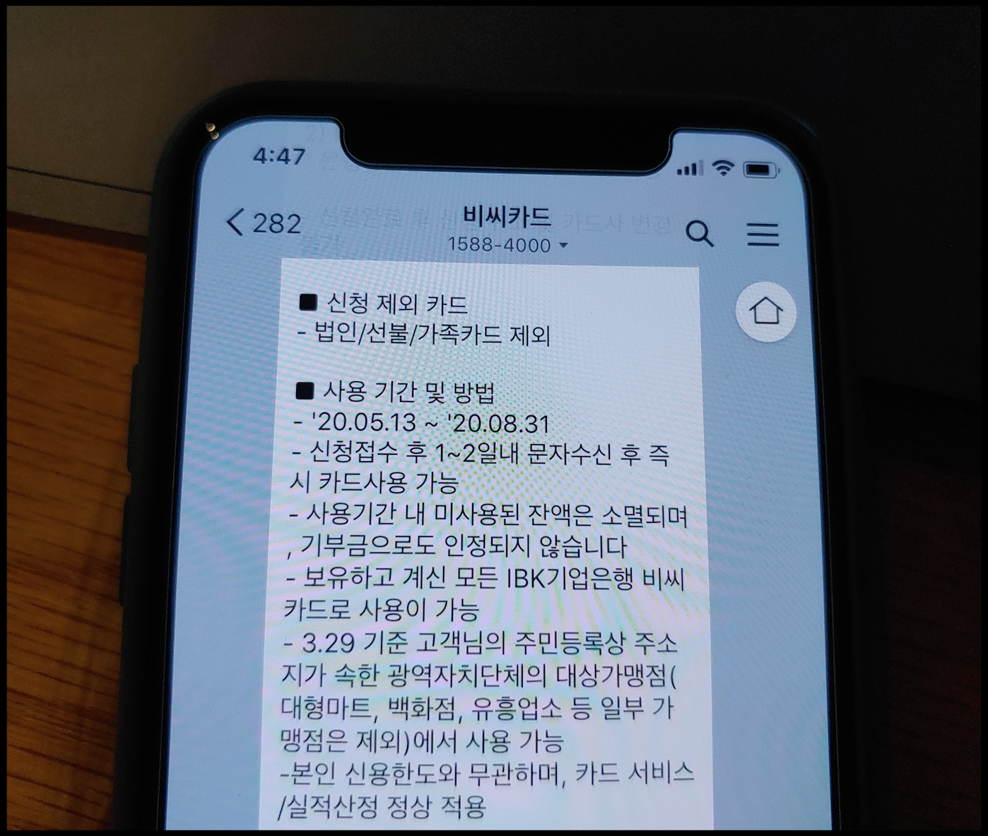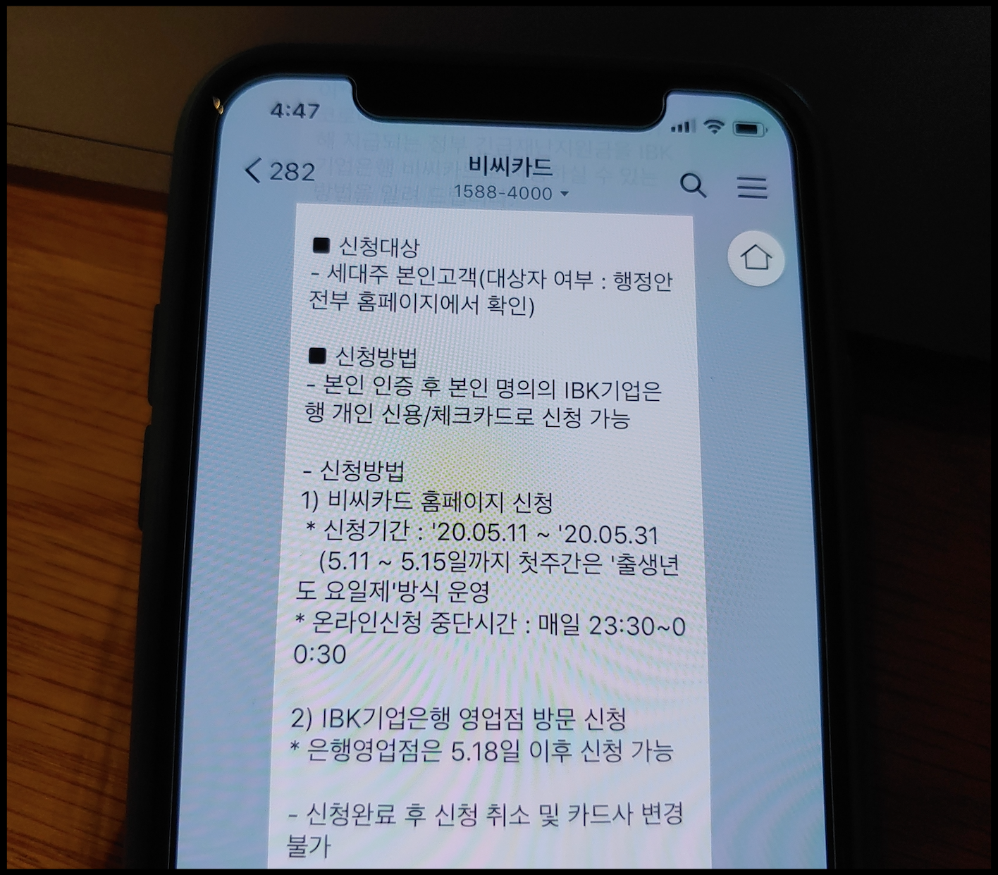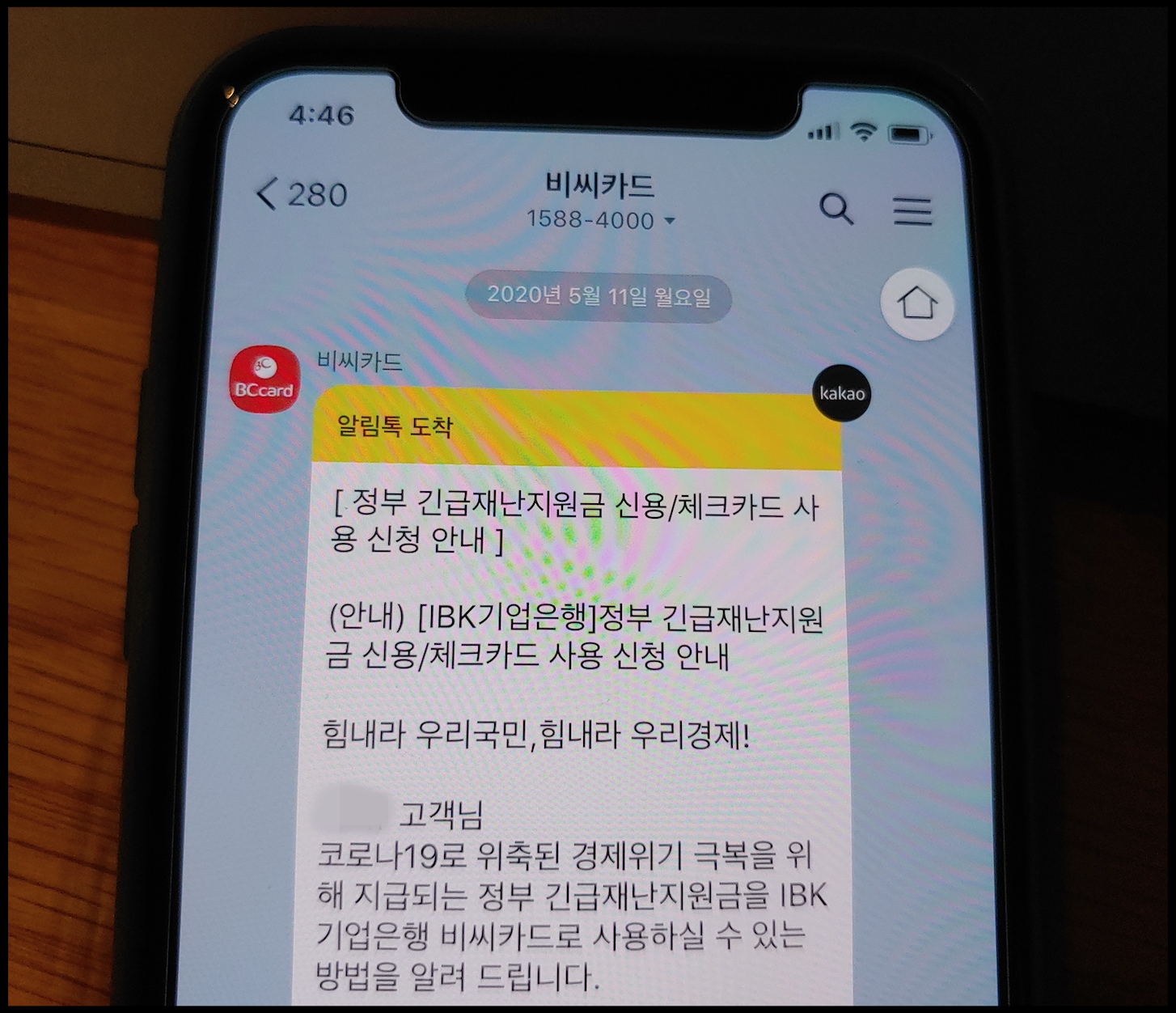 [사진 = 저 같은 경우 지난 11일 카카오톡을 통해 비씨카드 긴급 재난지원금 신청 안내와 관련된 메시지를 받았습니다. 저는 IBK기업은행 체크카드 소지하는 중인데 그 카드에 비씨카드 로고가 새겨졌습니다. IBK기업은행은 비씨카드의 BC 회원사입니다. IBK기업은행 긴급재난지원금 신청 관련하여 만약 해당 카드가 비씨카드와 연결되어 있다면 긴급 재난지원금 신청 가능한 것으로 보입니다. 저에게 카카오톡 메시지가 날아온 것을 봐도 말입니다. 만약 IBK기업은행 체크카드 또는 신용카드가 비씨카드와 연결되었는데 해당 카드를 일상생활에서 주로 쓰시는 분들 중에는 비씨카드 재난지원금 신청 염두하는 분들이 있을 것으로 예상됩니다. (C) 나이스블루]