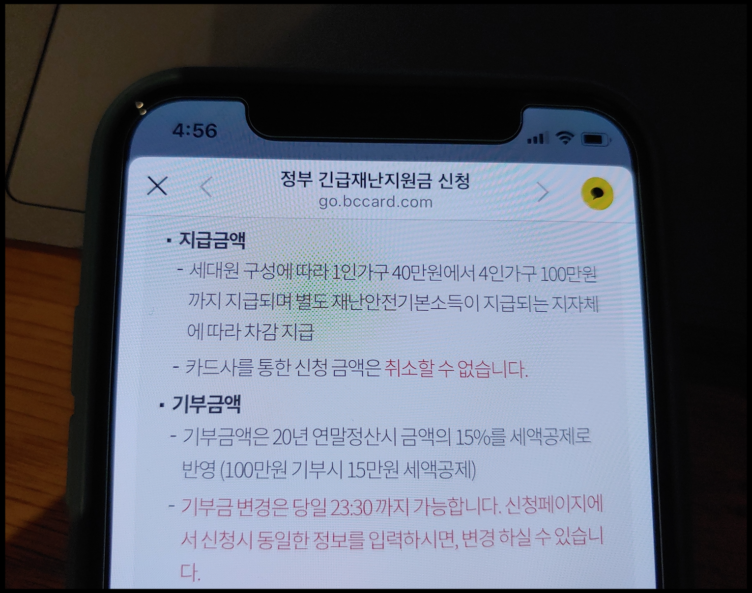 [사진 = 비씨카드 지급금액은 1인가구 40만원부터 4인가구 이상 100만원까지 입니다. 특히 카드사 통해서 신청할 경우 금액 취소 불가능한 점 확인하시기 바랍니다. 아울러 긴급재난지원금 신청 기부 금액 주목하는 분들도 있을 것 같습니다. 2020년 연말정산 할 때 금액 15%를 세액공제로 반영됩니다. 기부금 변경은 당일 23:30까지 가능하다는 점 참고하시기 바랍니다. 간혹 신청 과정에서 기부를 잘못 눌러서 신청하시는 분들이 있는 것으로 압니다. 기부 여부를 확인한 뒤에 꼼꼼하게 신청하시기 바랍니다. (C) 비씨카드 공식 홈페이지]