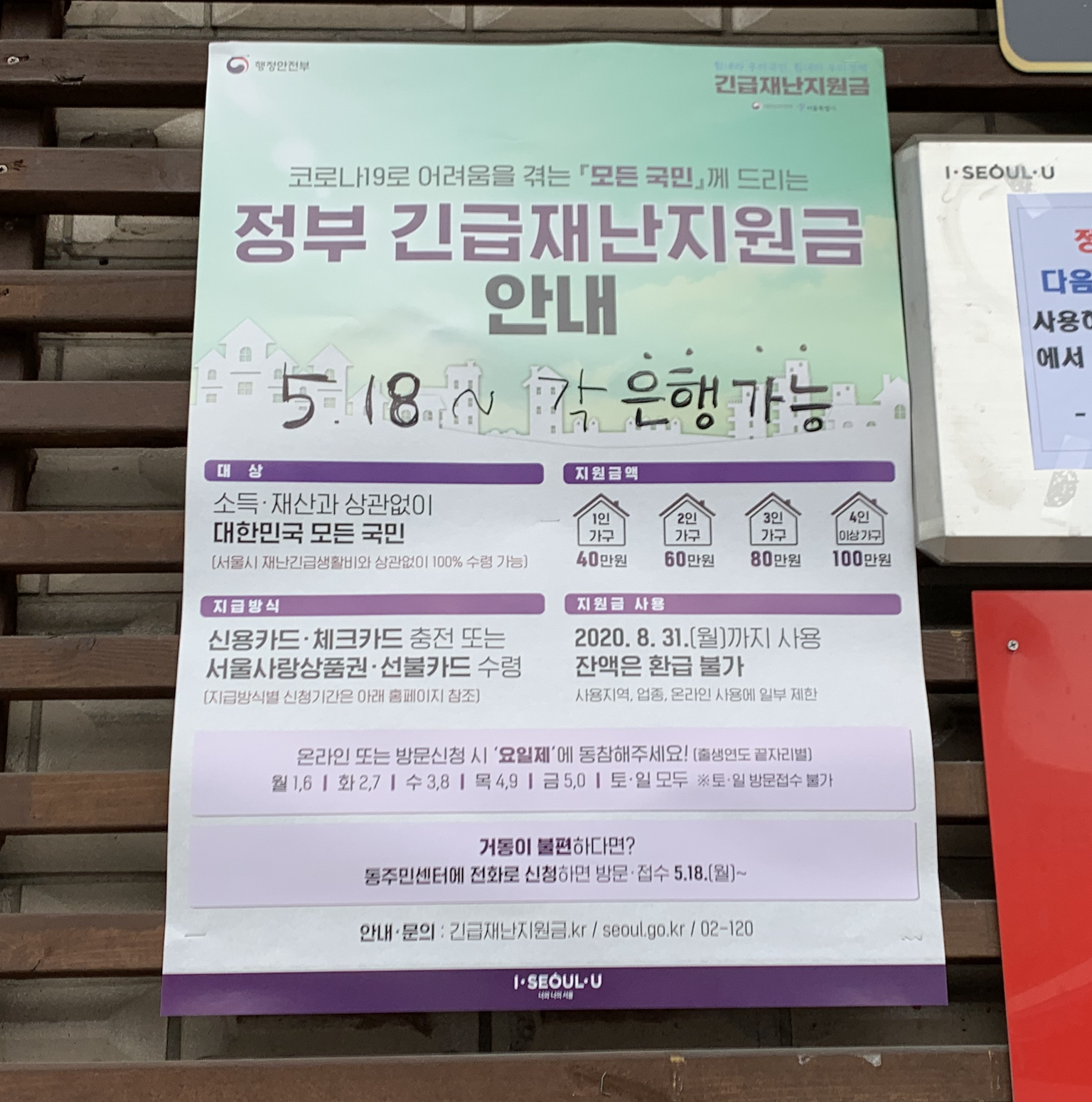 [사진 = 서울 시내의 한 주민센터에서는 정부 긴급재난지원금 안내하는 포스터를 알렸습니다. 오는 5월 18일부터 읍/면/동 단위의 주민센터를 통해 긴급재난지원금 선불카드 신청 가능합니다. 선불카드 뿐만 아니라 지역사랑상품권도 주민센터에서 신청할 수 있습니다. 서울 지역 같은 경우에는 서울사랑상품권이라는 이름으로 나올 예정입니다. 오프라인에서 긴급재난지원금 선불카드 및 지역사랑상품권 지원받으려면 주민센터를 방문해야 합니다. 온라인에서도 신청할 수 있으나 방문 신청을 선호하는 사람이라면 주민센터 이용이 편리합니다. (C) 나이스블루]