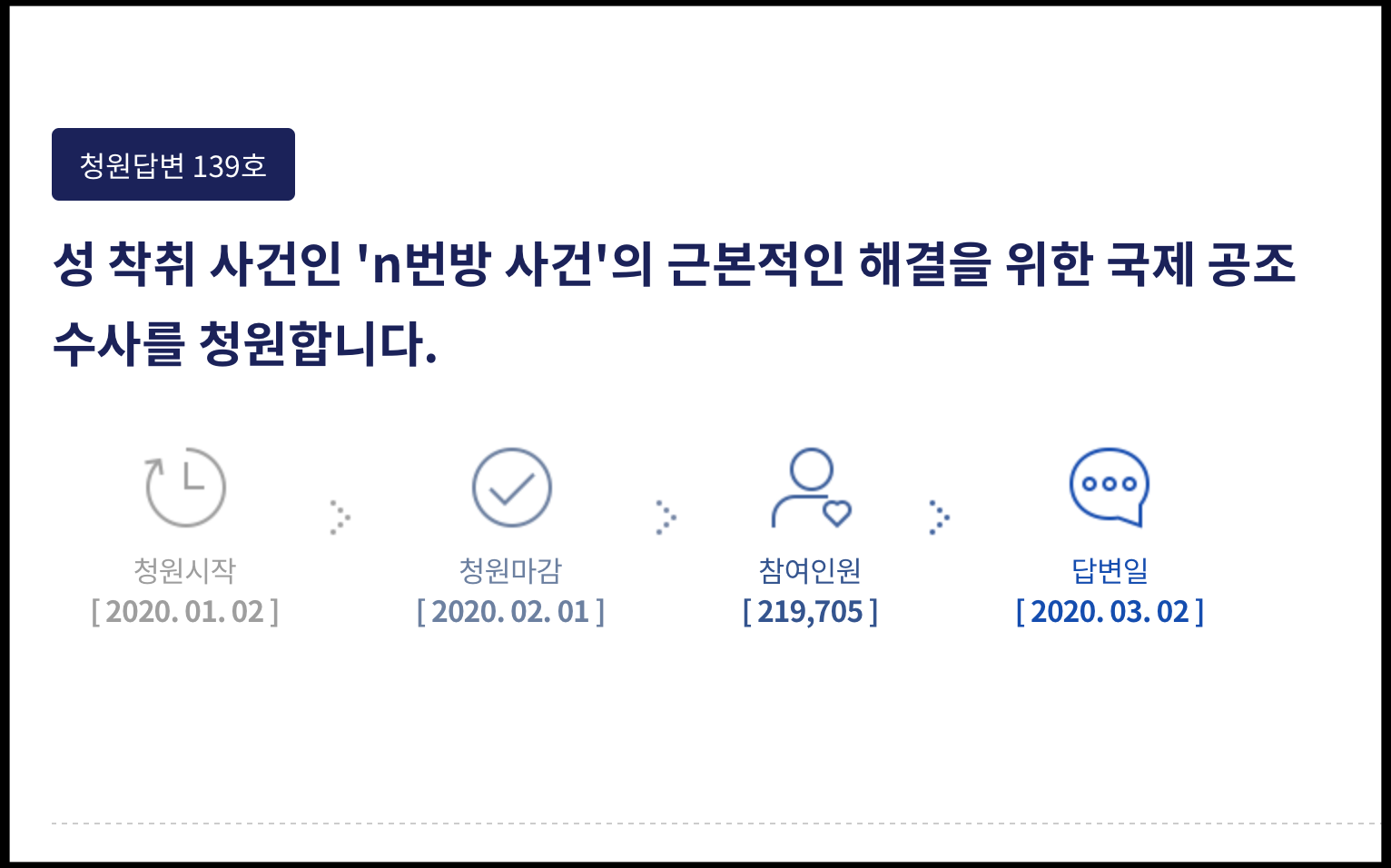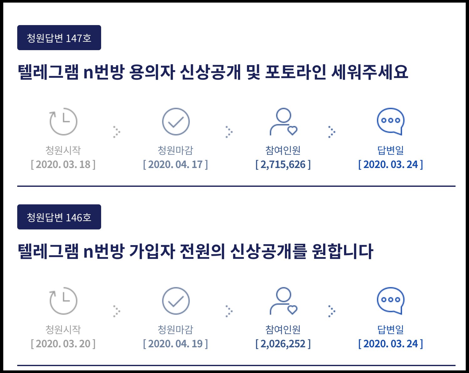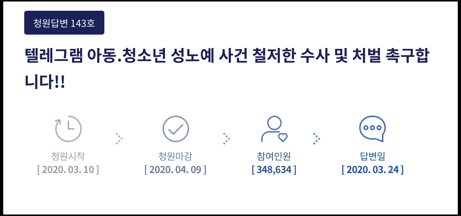 [사진 = 청와대 국민청원에서는 텔레그램 N번방 사건과 관련된 청원 참여 인원이 200만 명 돌파했습니다. 그 중에 N번방 용의자 신상공개 및 포토라인 세워달라는 청원에는 271만 명이 청원 참여했습니다. (C) 청와대 국민청원 공식 홈페이지]