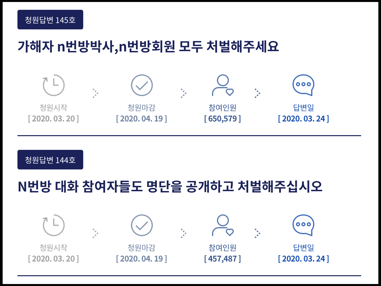 [사진 = 그 외에 또 다른 N번방 사건 청원도 참여 인원 20만 명 돌파했습니다. 청와대 국민청원은 특정 청원에 대하여 30일 동안 참여 인원 20만 명 넘을 경우 정부 및 청와대 책임자가 답변합니다. 현재 답변 대기 중인 청원들 중에서도 N번방 관련 청원이 꽤 있습니다. N번방 사건 향한 여론의 관심이 지속적임을 알 수 있습니다. 한국 사회에 큰 충격을 안겨줬던 사건이었으니 말입니다. (C) 청와대 국민청원 공식 홈페이지]