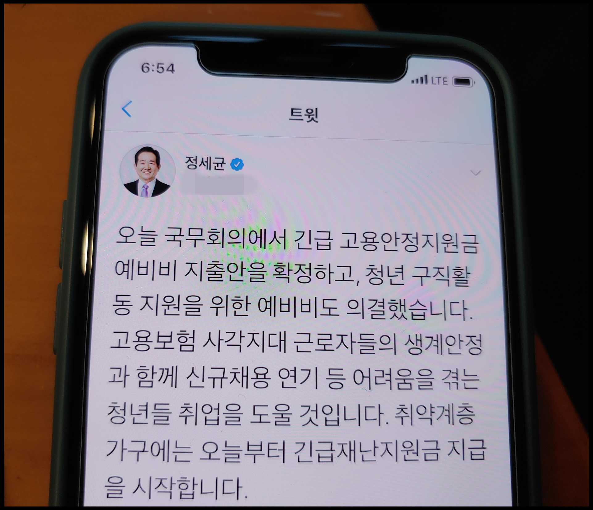 [사진 = 정세균 국무총리는 5월 4일 트위터를 통해 이날 국무회의에서 긴급고용안정지원금 예비비 지출안 확정되었음을 알렸습니다. 그와 더불어 청년구직활동 지원을 위한 예비비 의결에 이르기까지 국민들의 생계지원을 위해 최선을 다하고 있음을 알렸습니다. (C) 정세균 국무총리 공식 트위터]