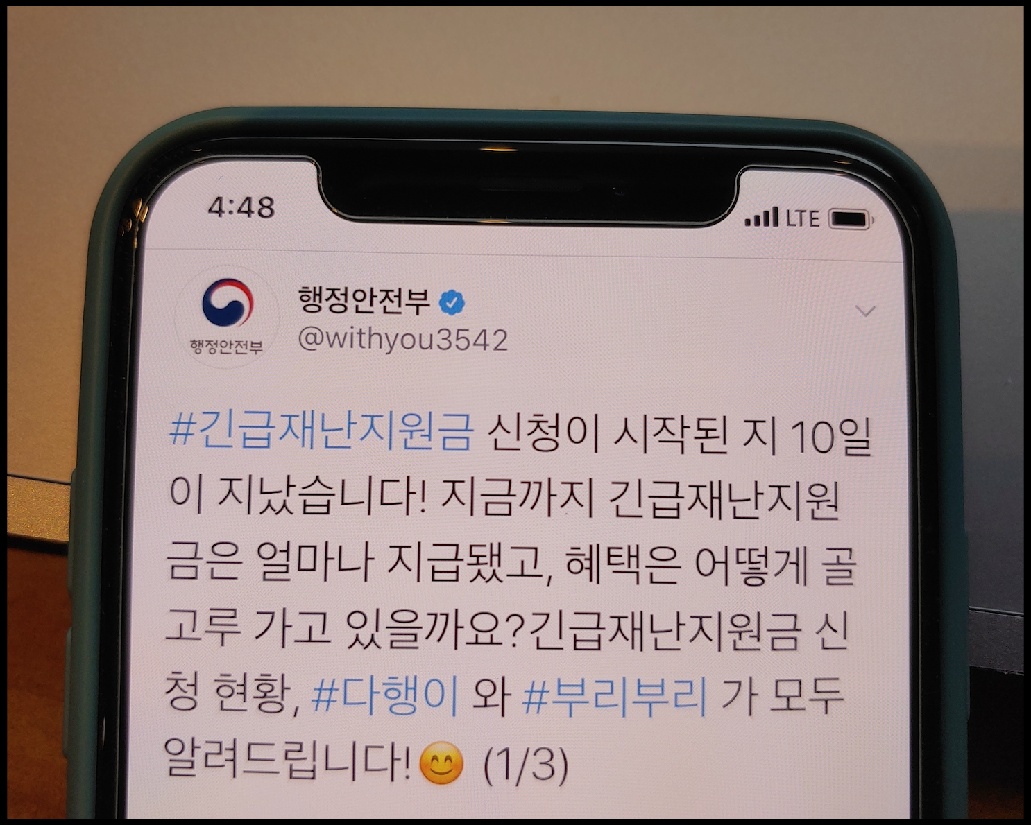 [사진 = 행정안전부 공식 트위터에서는 긴급재난지원금 신청 첫 주에 매일 약 200만 건 신청 되었다고 밝혔습니다. 그와 더불어 거의 모든 취약계층 가구 지급이 완료되었다고 합니다. 한국 전체 2,171만 가구 대부분 이번 달에 신청 및 지급 완료 될 것이라고 기대했습니다. 이는 많은 사람들이 긴급재난지원금 신청했음을 알 수 있습니다. 참고로 정부 긴급재난지원금 신청은 지역사랑상품권 모바일형을 제외하면 8월 31일까지 소진해야 합니다.(반면 지역사랑상품권 모바일형은 8월 31일까지 사용을 권장하고 있으나 실제로는 5년으로 알려졌습니다.) 한국에서 8월 31일까지 긴급재난지원금 사용하려는 사람이 많을 것으로 보입니다. (C) 행정안전부 공식 트위터]