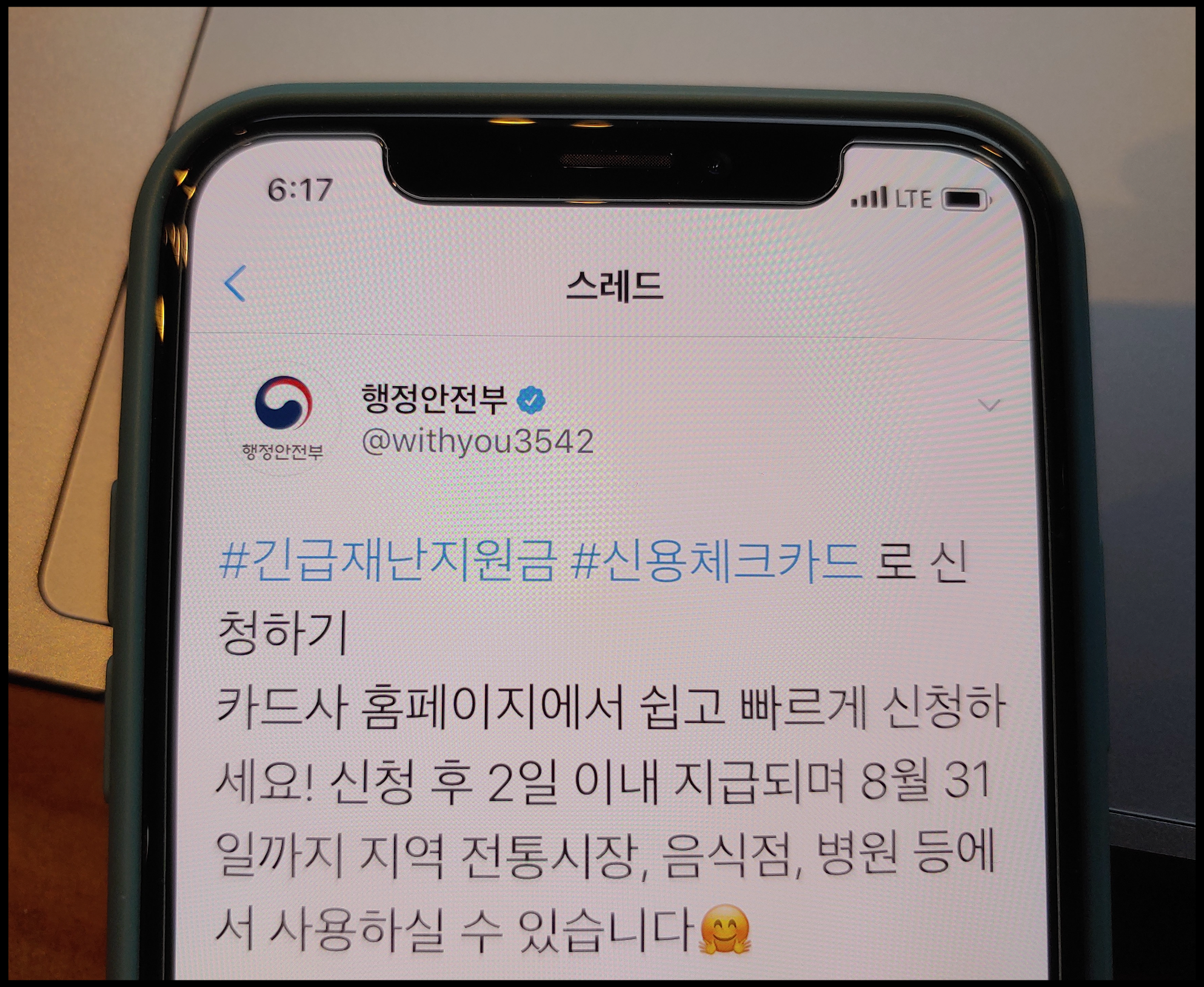 [사진 = 행정안전부 공식 트위터에 따르면 긴급재난지원금 신용카드 및 체크카드 신청 시 이틀 이내로 지급되며 8월 31일까지 지역 전통시장이나 음식점, 병원 등에서 사용 할 수 있다고 언급했습니다. (C) 행정안전부 공식 트위터]