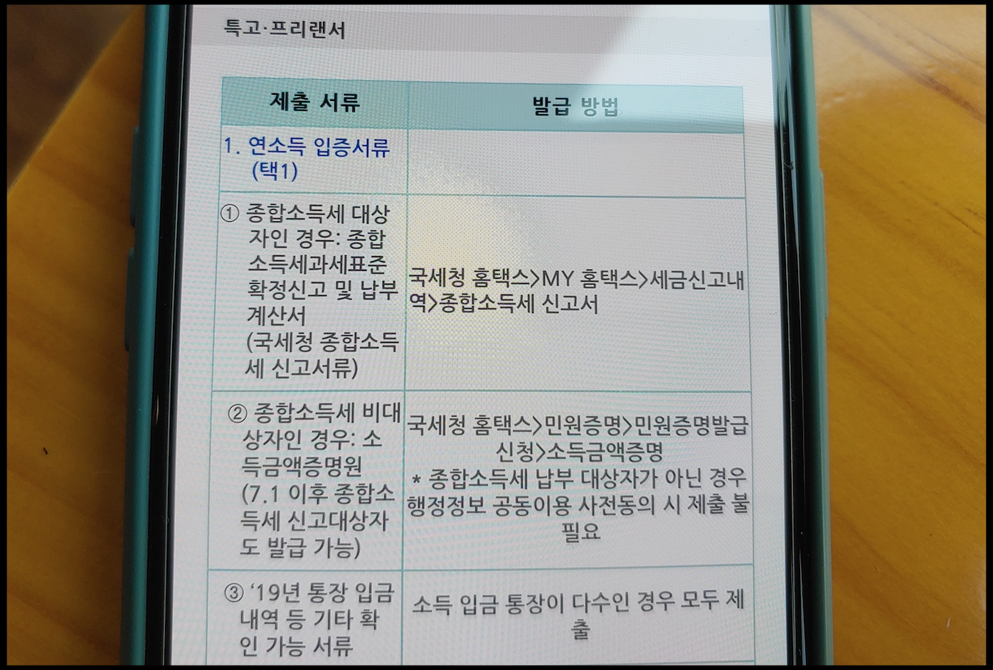 프리랜서 및 특수형태근로종사자 분이라면 연소득 입증서류가 필요합니다. 종합소득세 대상자라면 종합소득세과세표준확정신고 및 납부계산서(국세청 종합소득세 신고서류), 대상자가 아니라면 소득금액증명원(7.1 이후 종합소득세 신고대상자도 발급 가능), 2019년 통장 입금 내역 등 기타 확인 가능 서류 중에서 하나를 선택하면 됩니다.