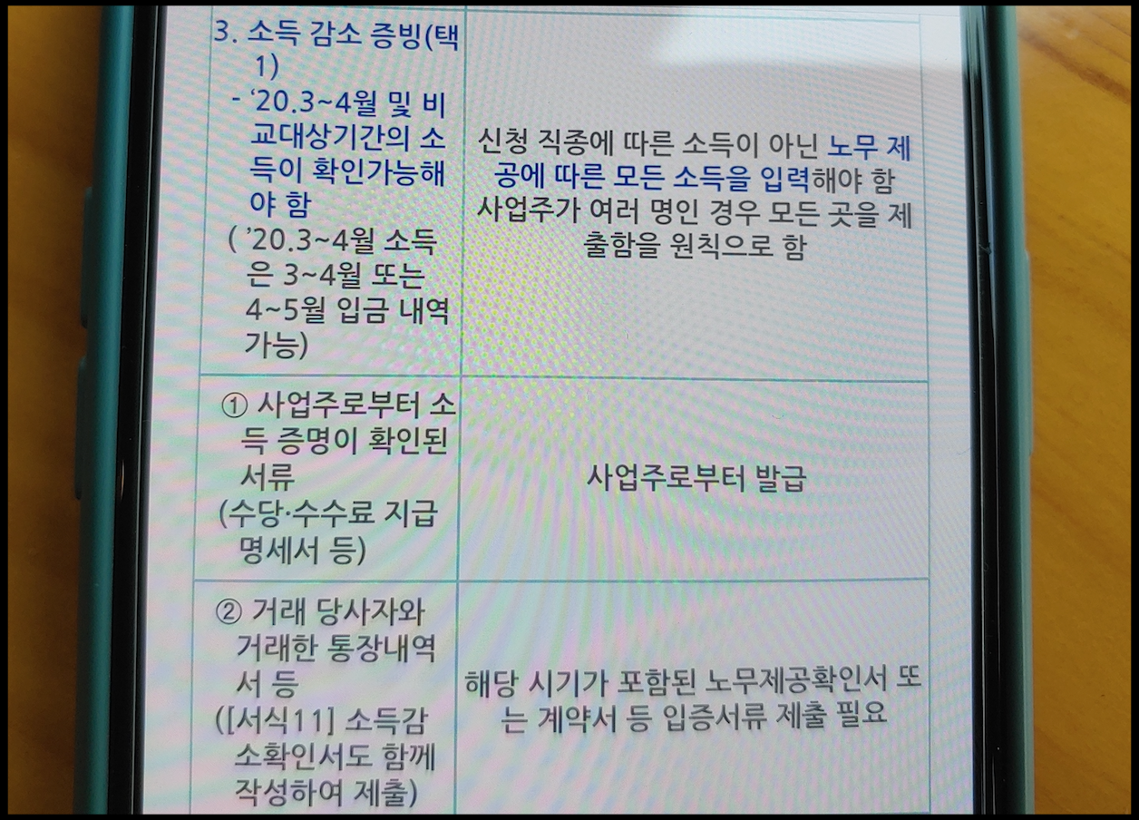 소득 감소 증빙에 대해서는 제출 서류 중에 하나를 선택해야 합니다. 특히 2020년 3월부터 4월 및 비교대상기간의 소득이 확인가능해야 합니다.