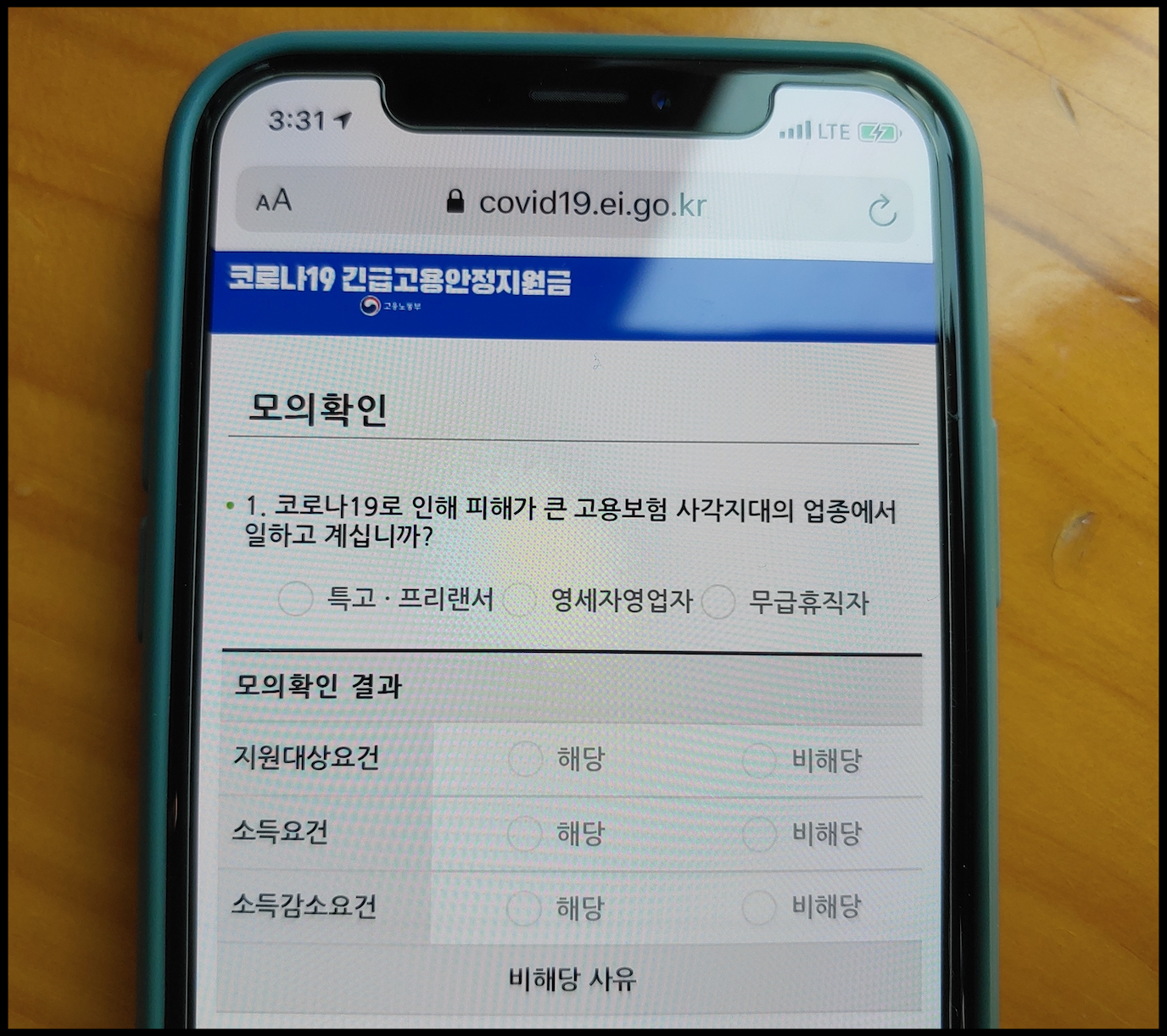 만약 긴급고용안정지원금 받을 수 있는지 아닌지 자세히 알고 싶다면 긴급고용안정지원금 모의확인 기능을 통해서 확인할 수 있습니다. 특고 및 프리랜서, 영세자영업자, 무급휴직자 중에 하나를 선택해서 모의확인 하시면 됩니다.