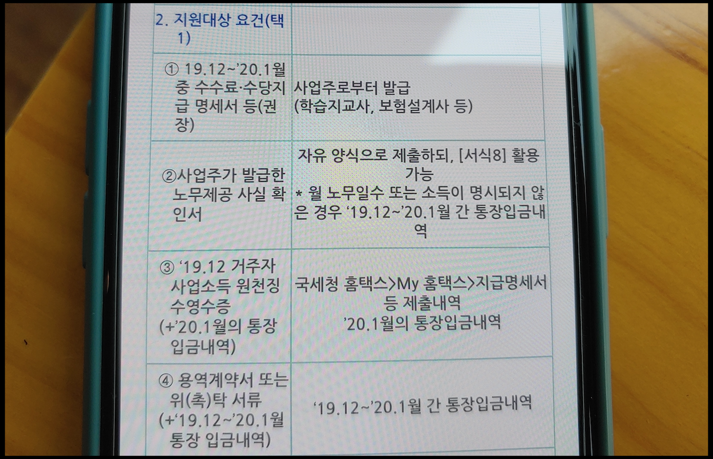 [사진 = 긴급고용안정지원금 지원 받을 수 있는 프리랜서와 특수형태근로종사자는 2019년 12월부터 2020년 1월까지 노무를 제공하고 소득이 발생했는데 고용보험 미가입했던 분들에 한합니다. 매월 5일 이상의 노무를 제공했거나(2019년 12월부터 2020년 1월 중 합산 10일) 혹은 매월 25만원(2019년 12월부터 2020년 1월 중 합산 50만원) 이상의 소득 있는 사람을 의미합니다. 신청 과정에서 증빙서류가 필요할 경우 해당 기간 프리랜서, 특수형태근로종사라조 일했던 것과 더불어 그 기간 동안 총 10일 이상 노무 제공 or 50만원 소득 발생을 확인할 수 있어야 합니다. 제출 서류는 2019년 12월~2020년 1월 중에서 수수료 및 수당지급 명세서 등을 권장하고 있습니다. 학습지 교사 등으로 일하시는 분이라면 사업주로부터 발급 받을 수 있습니다.