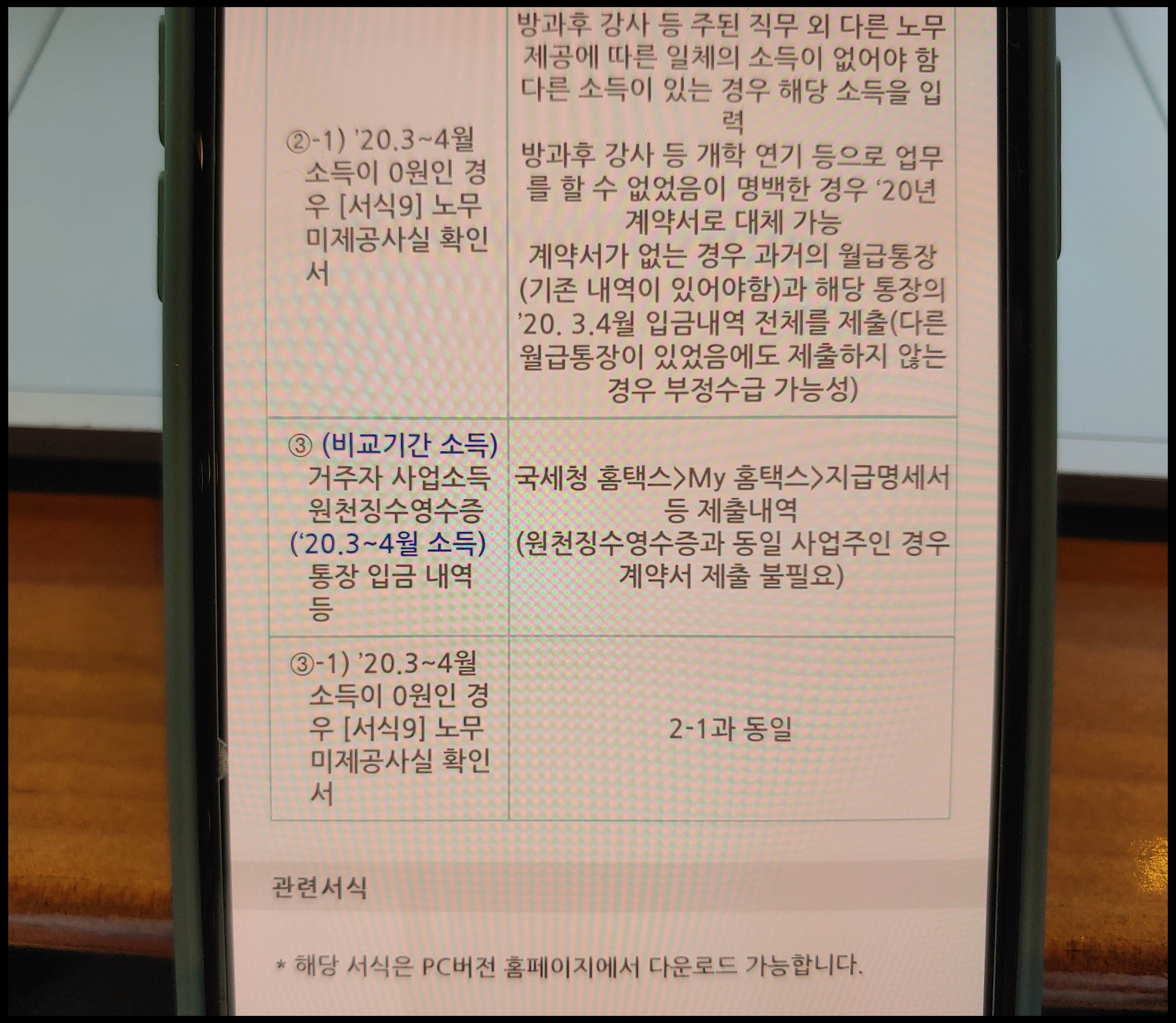 소득 감소 증빙 항목에서도 하나를 선택할 수 있습니다. 그 중에 노무미제공사실 확인서가 눈에 띕니다. 2020년 3월부터 4월까지 소득 0원이어야 하나 방과후 강사 등 개학 연기 등으로 업무 못했다면 '20년 계약서로 대체할 수 있다고 합니다. 만약 계약서 없다면 과거 월급통장이나 해당 통장의 '20 3~4월 입금내역 전체 제출하시면 됩니다. 여기서 중요한 점 하나는 노무미제공사실 확인서 서식은 모바일이 아닌 PC버전에서 다운로드 받으셔야 합니다.