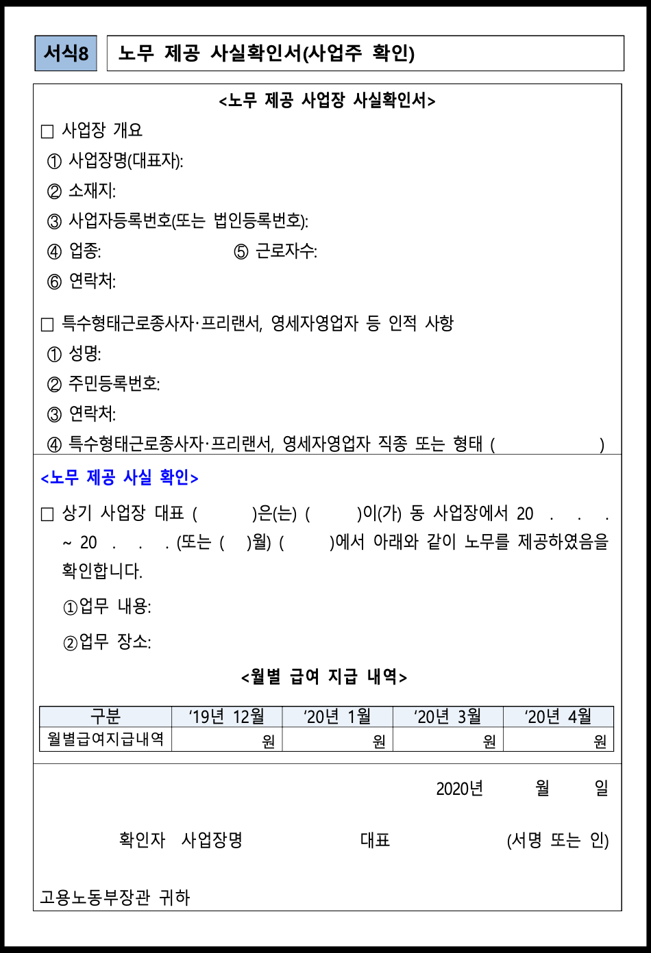 또 다른 서식에는 노무제공사실 확인서 양식 있습니다. 해당 서식도 사업주 확인을 거쳐야 합니다. 특정 기간 동안 노무 제공했다는 것이 언급되어 있어야 합니다. 월별 급여 지급 내역은 2019년 12월, 2020년 1월, 2020년 3월, 2020년 4월에 대하여 표기됐습니다.
