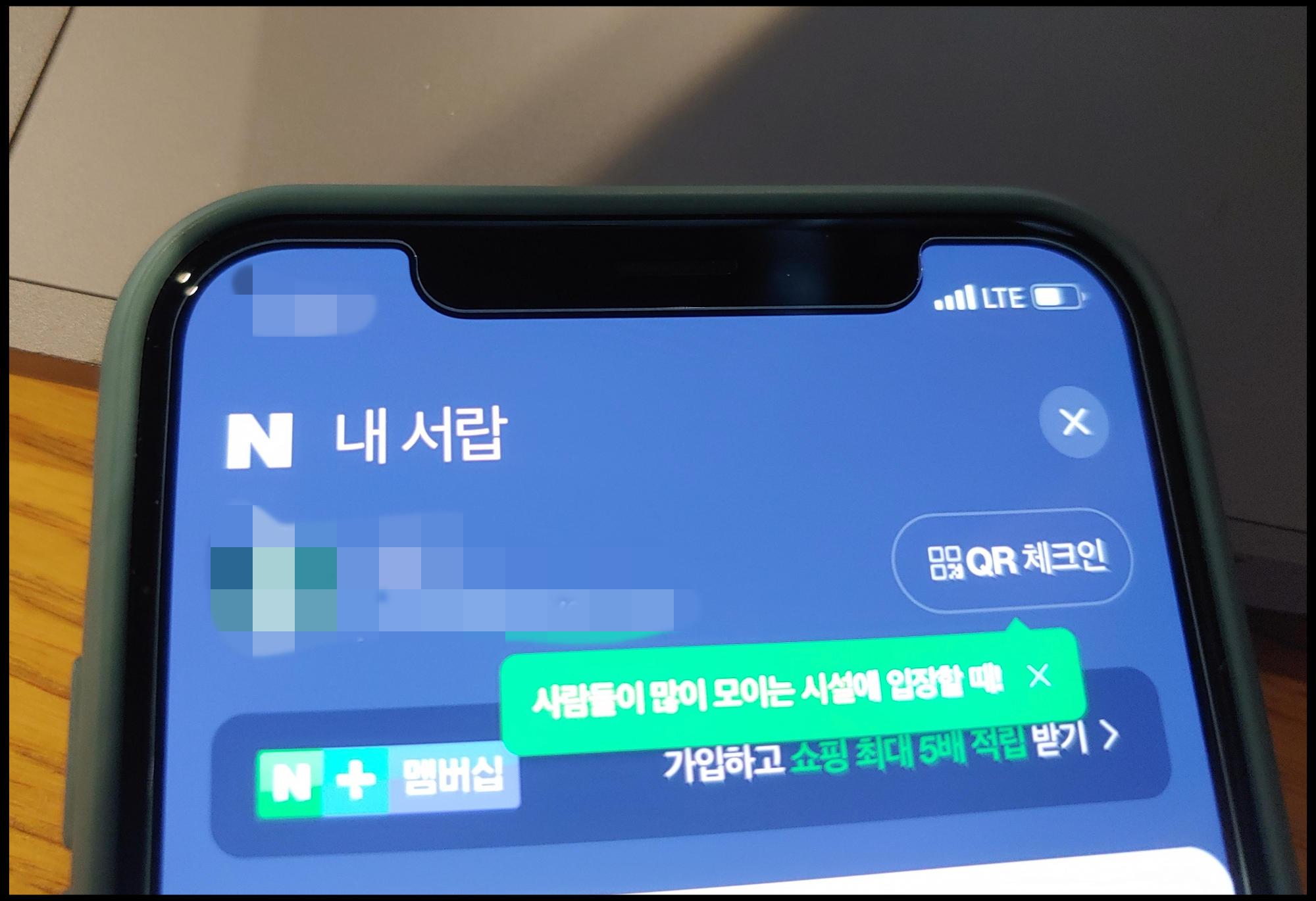 내 서랍 영역에서는 화면 오른쪽 상단에 QR 체크인이라고 되어 있는 곳이 있습니다. '사람들이 많이 모이는 시설에 입장할 때!'라는 문구가 뜨는데 그 곳으로 접속하면 됩니다.