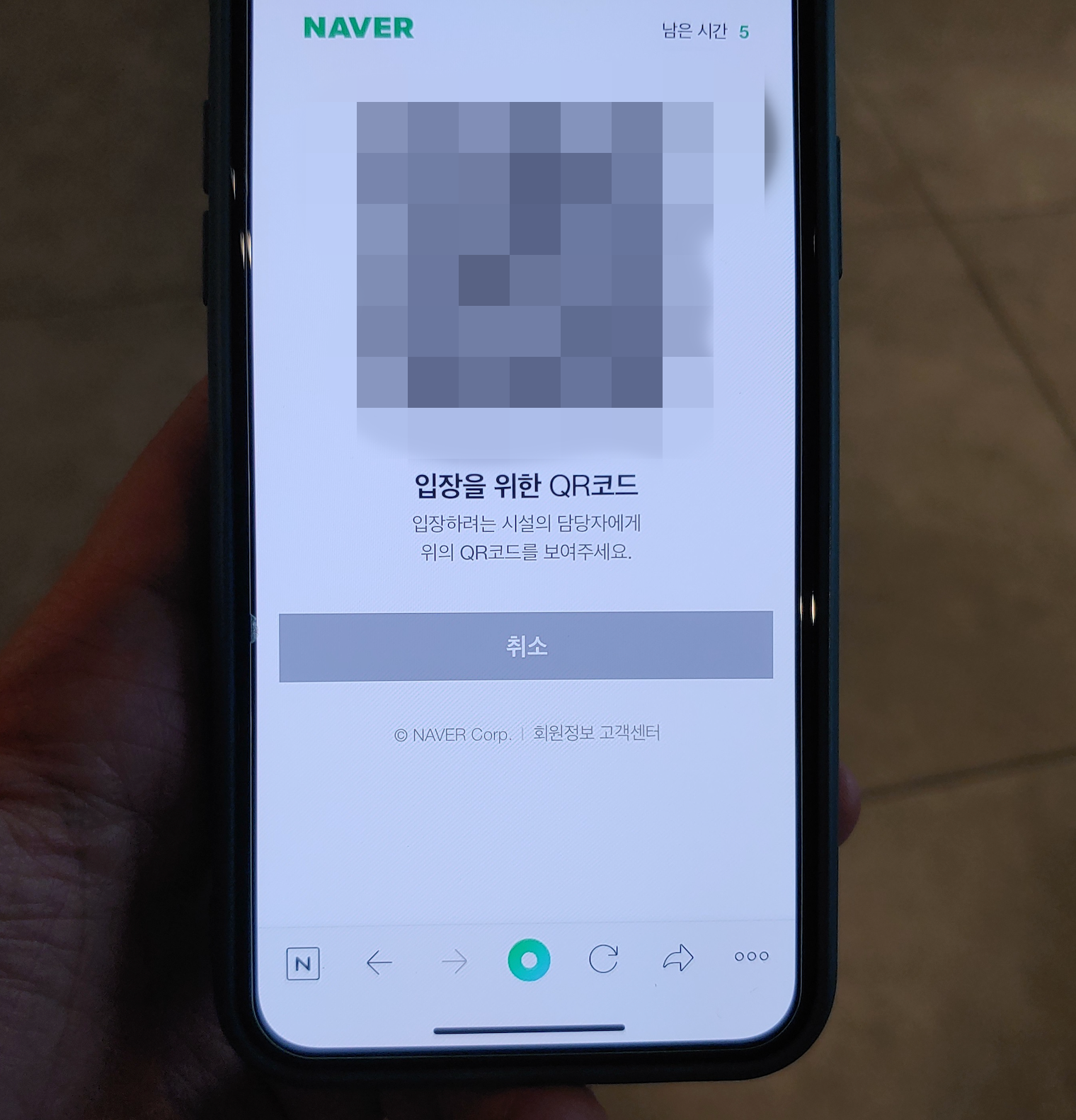그 이후 이렇게 QR코드가 뜹니다. 해당 QR코드를 입장하는 시설 담당자에게 보여주면서 확인하시면 됩니다. 남은 시간이 그리 길지 않기 때문에 될 수 있으면 QR코드 뜨자마자 신속하게 보여주셔야 할 것으로 보입니다. 이러한 과정을 보면 QR코드 전자출입명부 사용법 쉽다는 것을 알 수 있습니다.