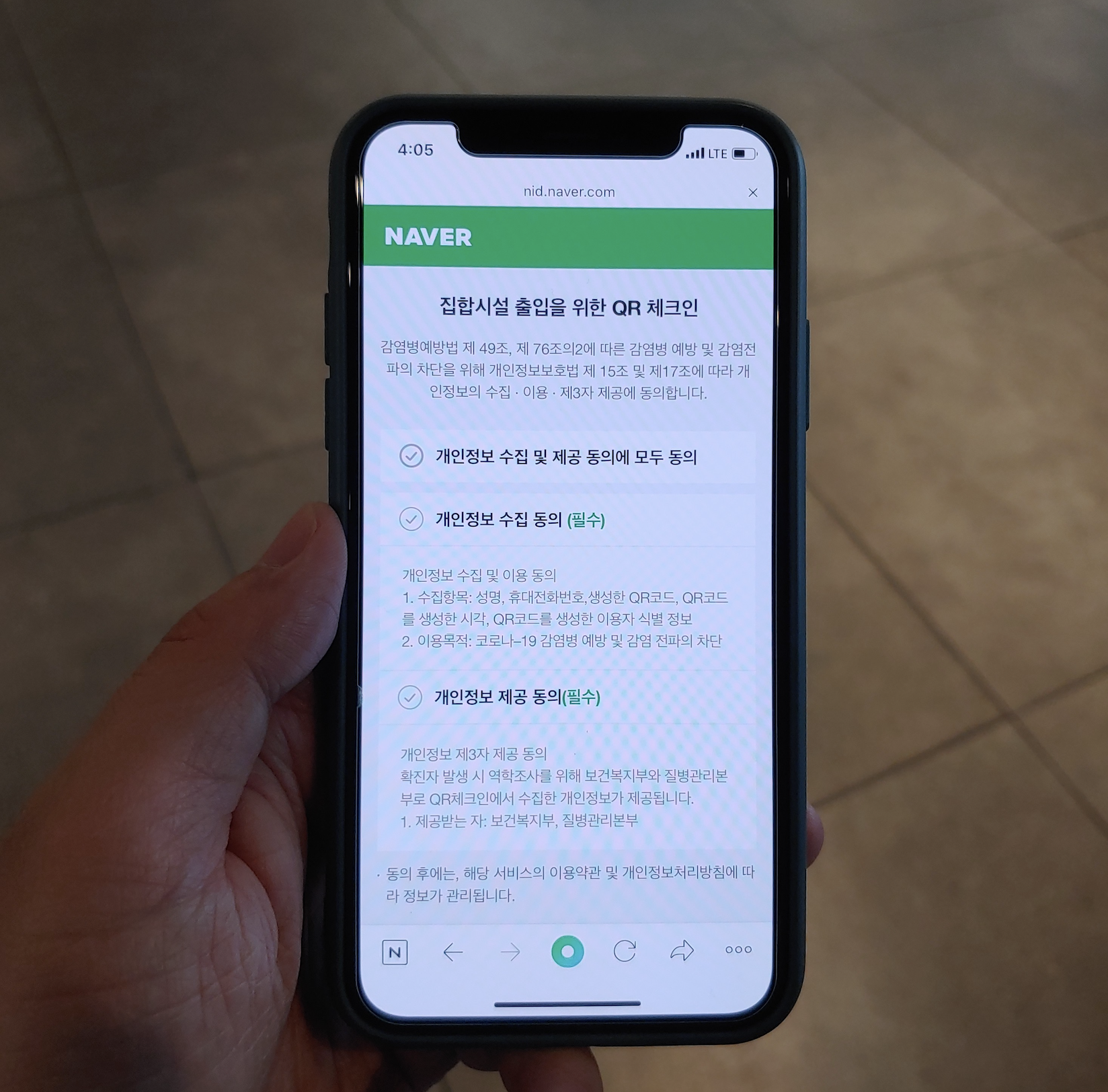 집합시설 출입을 위한 QR 체크인에서는 개인정보 수집 및 제공 동의에 모두 동의하셔야 합니다. 감염병예방법 제 49조, 제76조의2에 따른 감염병 예방 및 감염전파의 차단을 위해 개인정보보호법 제15조 및 제17조에 따라 개인정보의 수집, 이용, 제3자 제공 동의 관련 부분이 있습니다. 개인정보 이용목적은 코로나19 감염병 예방 및 감염 전파의 차단이라고 합니다. 개인정보 제공받는 자는 보건복지부, 질병관리본부로 나타납니다. 즉, QR코드 전자출입명부 이용할 경우 개인정보는 보건복지부와 질병관리본부가 제공 받게 됩니다.