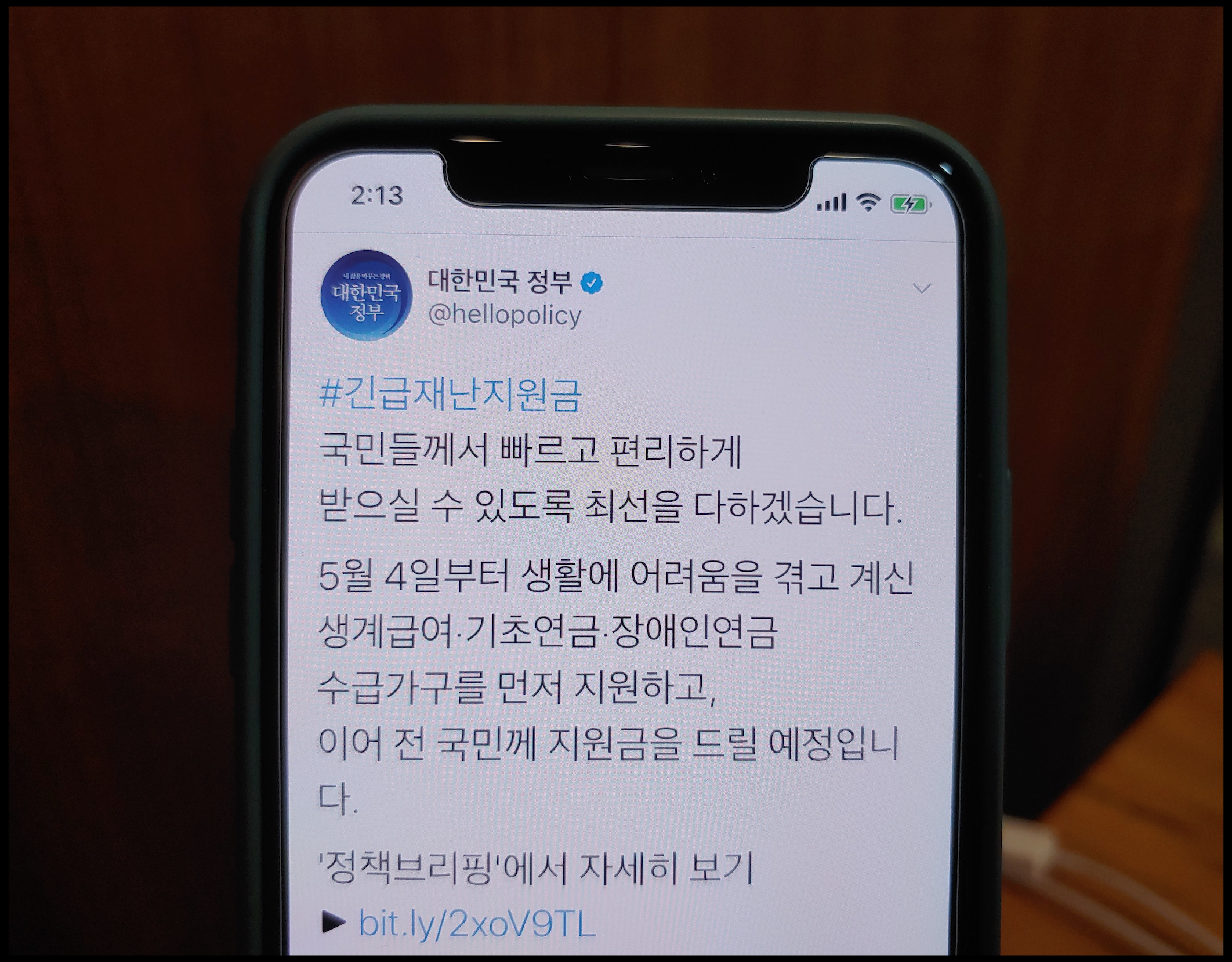 [사진 = 대한민국 정부 공식 트위터에서는 지난 5월 1일 긴급재난지원금 지급 절차에 대한 안내를 했습니다. 그 핵심은 전 국민 지원금 지급입니다. 당초에는 소득하위 70% 가구에게 지원금 지급하기로 했으나 혜택 범위가 더 넓어졌습니다. 예산을 더 많이 확보했기 때문입니다. 추경 규모가 기존에는 7조 6,000억원이었는데 지난 4월 30일 국회에서 2차 추경안 통과되면서 12조 2,000억원으로 늘었으며 지방비 2조 1,000억원까지 포함하여 총 14조 3,000억원 정도의 예산이 확보됐습니다. (C) 대한민국 정부 공식 트위터]