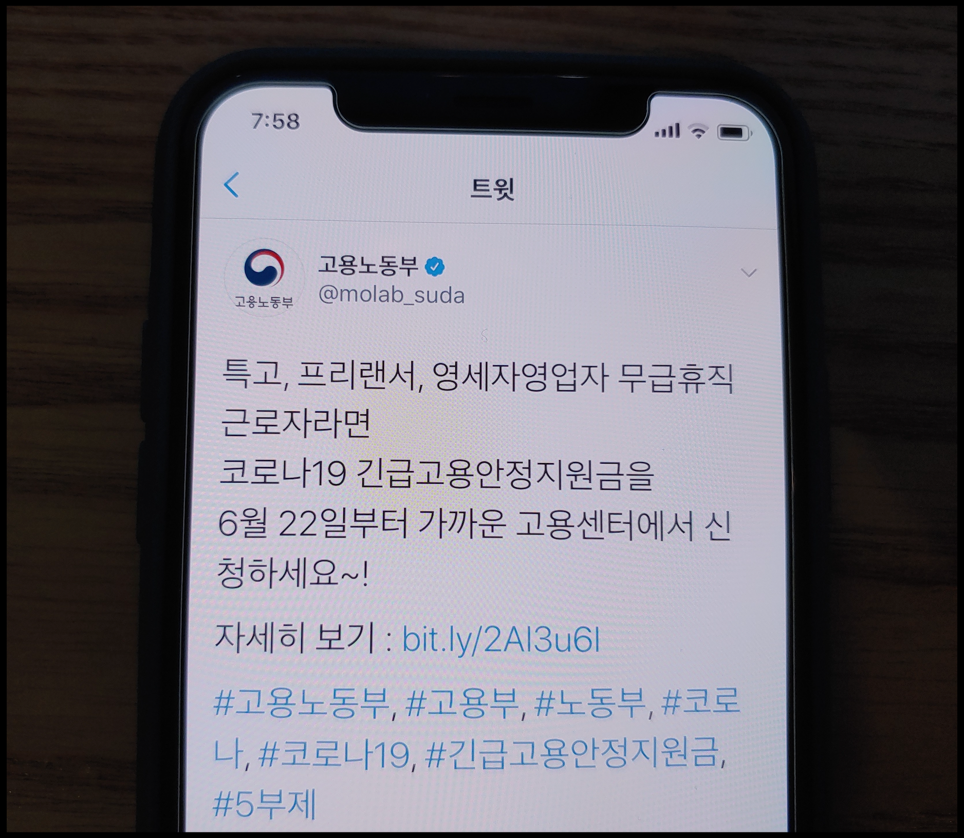 [사진 = 고용노동부 공식 트위터에서는 코로나19 긴급고용안정지원금 오는 6월 22일부터 가까운(주소지 관할) 고용센터 신청 가능하다고 밝혔습니다. 신분증, 신청서, 증빙서류를 지참해서 말입니다. 신청 시에는 5부제 적용됩니다. 출생년도 끝자리가 1,6(월)이면 6월 22일과 6월 29일, 2,7(화)은 6월 23일과 6월 30일, 3,8(수)는 6월 24일과 7월 1일, 4,9(목)은 6월 25일과 7월 2일, 5,0(금)은 6월 26일과 7월 3일에 신청하시면 됩니다. 반면 온라인 신청은 5부제 적용 종료됐습니다. 온라인의 경우 긴급고용안정지원금 홈페이지에서 신청하시면 됩니다. (C) 고용노동부 공식 트위터]