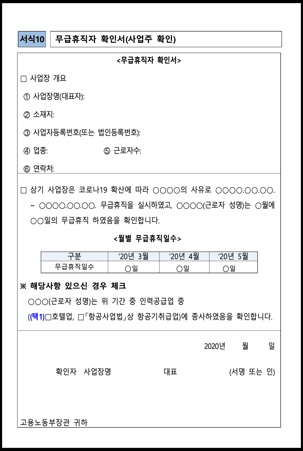 무급휴직확인서 양식, 사업주 확인 발급 필수(긴급고용안정지원금)