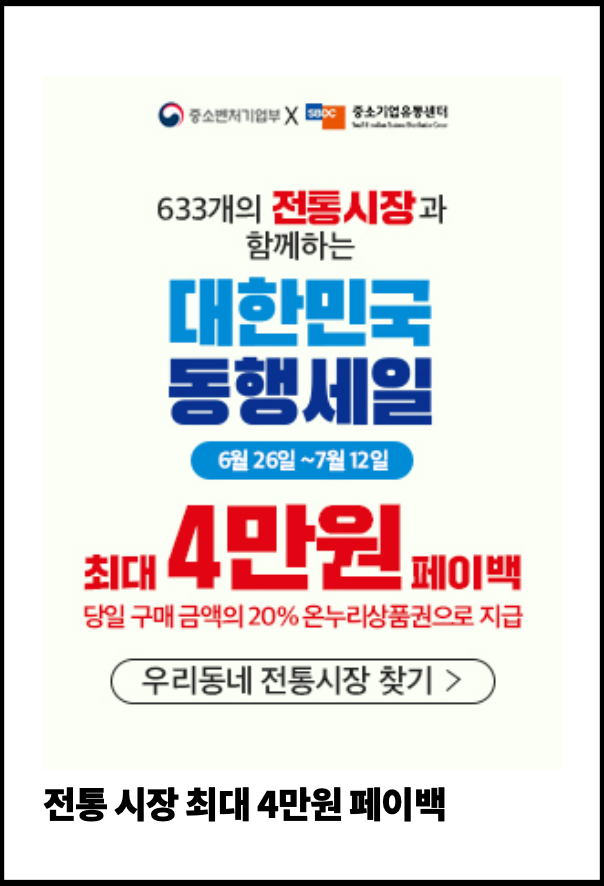 [사진 = 대한민국 동행세일 품목 중에서 오프라인 기획전 같은 경우 전통시장 최대 4만원 페이백 포함하여 동네슈퍼 최대 50% 할인 등이 있습니다. 백화점 주요 브랜드, 대형마트, 편의점, 침대 및 소파 할인과 더불어서 말입니다. (C) 대한민국 동행세일 공식 홈페이지]
