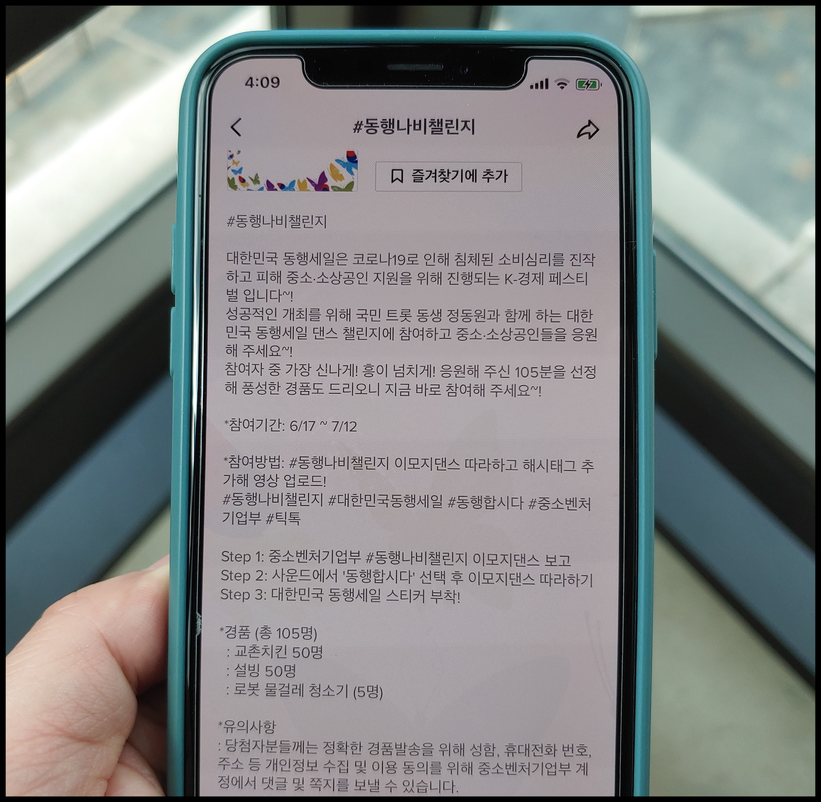 [사진 = 틱톡 앱에서 진행되는 대한민국 동행세일(2020년 6월 26일~7월 12일)의 #동행나비챌린지는 댄스 챌린지 참여 행사입니다. 정동원 노래에 맞춰 이모지 댄스를 따라하고 별도로 정해진 해시태그 추가해서 참여하는 분들 중에 105명은 경품을 받을 수 있습니다. 교촌치킨 50명, 설빙 50명, 로봇 물걸레 청소기 5명 증정됩니다. 현재 많은 사람들이 참여했습니다. 참고로 정동원은 대한민국 동행세일 홍보대사입니다. (C) 틱톡 앱, 앱스토어]