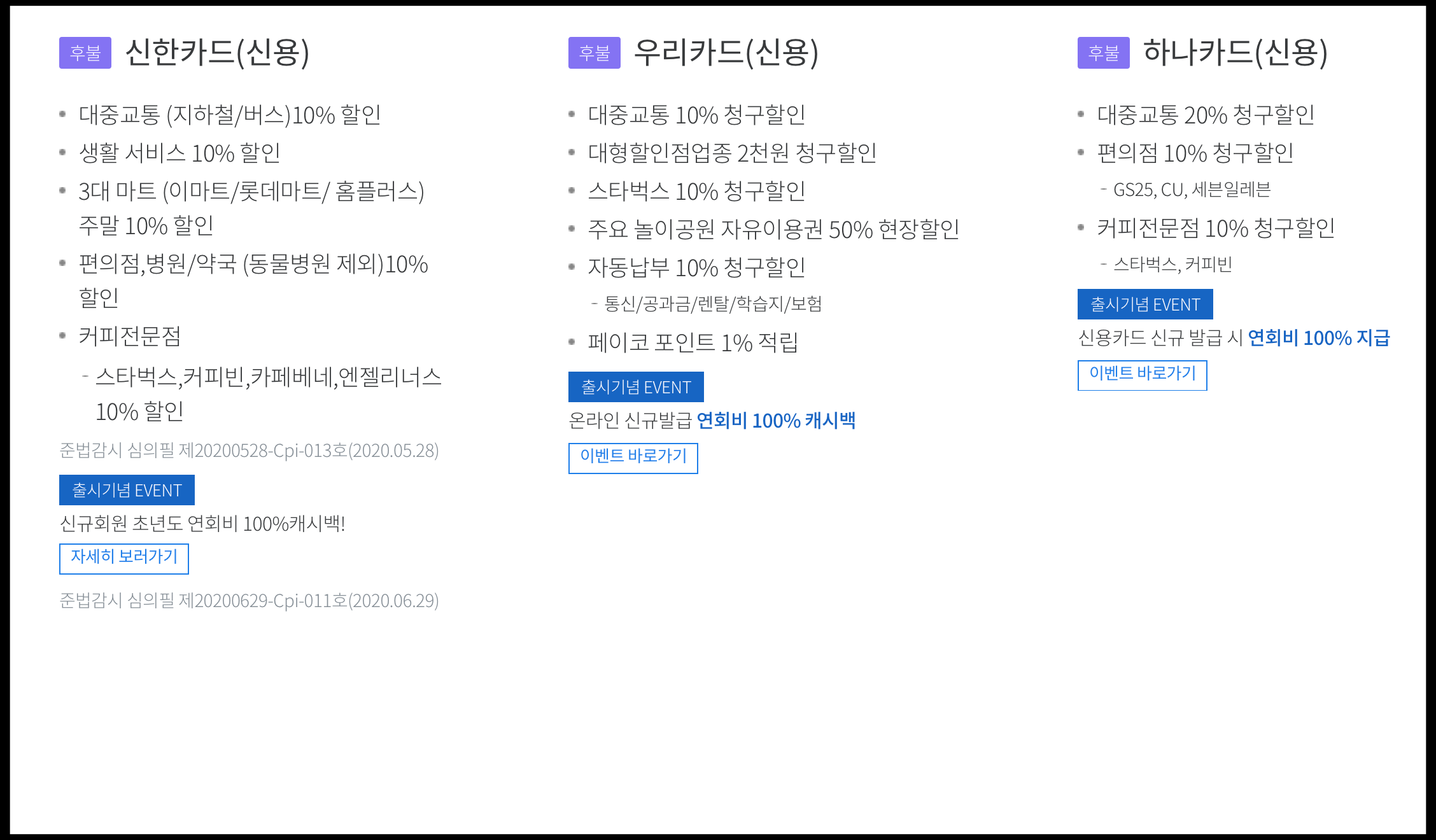[사진 = 광역알뜰교통카드 신한카드, 우리카드, 하나카드 신용카드로 신청 시 이러한 혜택이 있습니다. 어떤 곳은 커피전문점 혜택이 있다면 또 다른 곳은 자동납부 10% 청구할인되는 곳도 있습니다. (C) 광역알뜰교통카드 홈페이지]