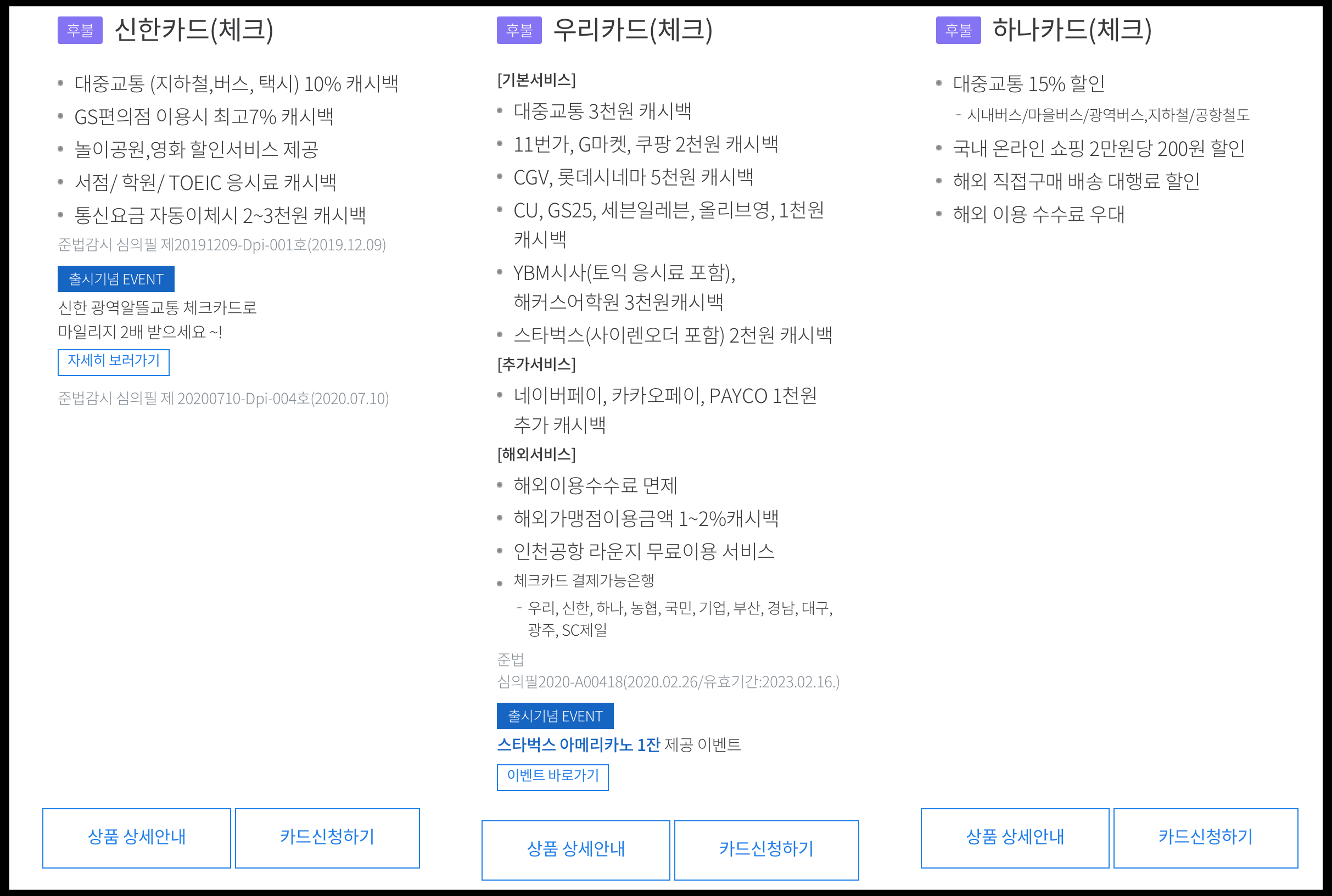 [사진 = 광역알뜰교통카드 신한카드, 우리카드, 하나카드 헤택이 서로 다르다는 것을 알 수 있습니다. 다만, 카드사 3사 모두 체크카드로 신청할 경우 연회비 없습니다. 신한카드는 신용카드가 생활서비스 10% 할인, 체크카드는 대중교통 10% 할인입니다. 우리카드는 신용카드가 대중교통 10% 할인, 체크카드는 대중교통 3천원 캐시백 혜택이 있습니다. 하나카드는 신용카드가 대중교통 20% 할인이며 체크카드는 대중교통 15% 할인입니다. 이러한 혜택을 누리려면 조건을 충족시켜야 합니다. (C) 광역알뜰교통카드 홈페이지 PC 버전]