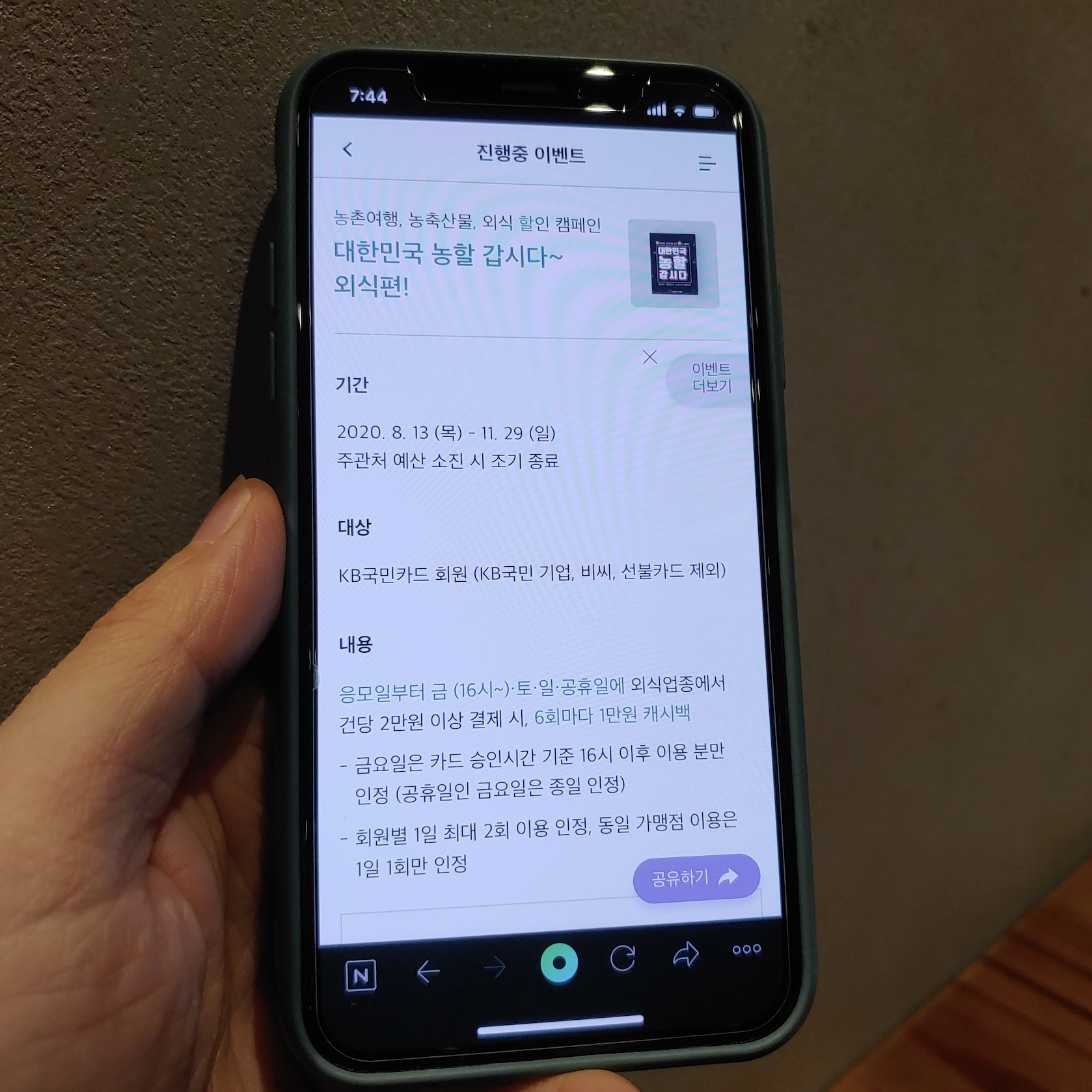 외식비 지원 유의사항 읽어보니 이 행사는 농림축산식품부, 한국농수산식품유통공사에서 시행하는 '대한민국 농활갑시다' 외식업종 캠페인임을 알 수 있습니다. 외식비 지원 총 캐시백 금액은 제한 없다고 합니다.