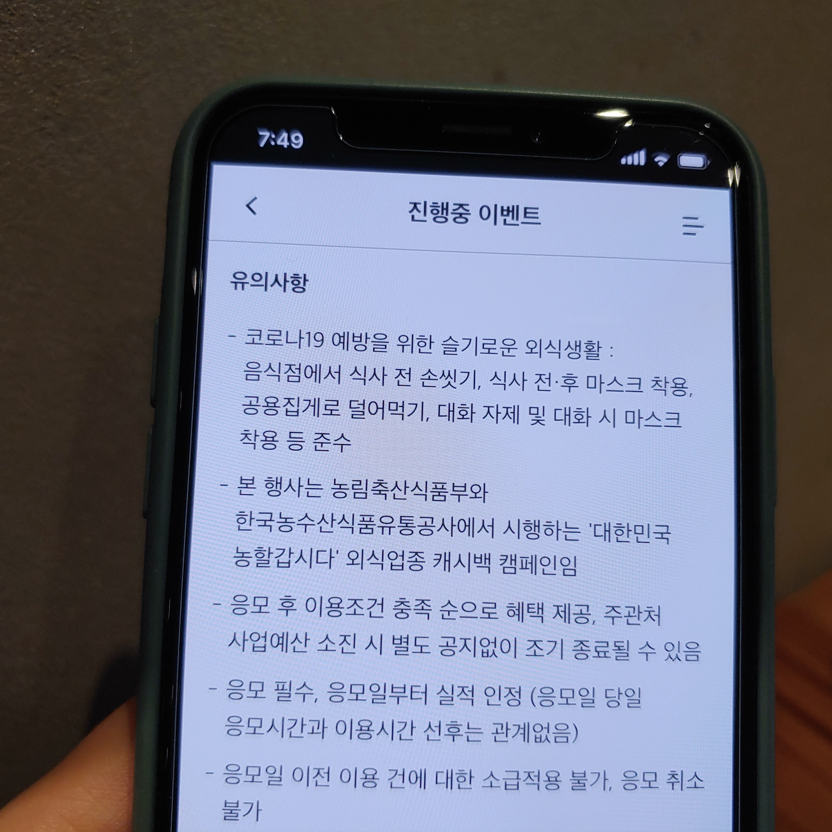 외식비 지원 유의사항 읽어보니 이 행사는 농림축산식품부, 한국농수산식품유통공사에서 시행하는 '대한민국 농활갑시다' 외식업종 캠페인임을 알 수 있습니다. 외식비 지원 총 캐시백 금액은 제한 없다고 합니다.