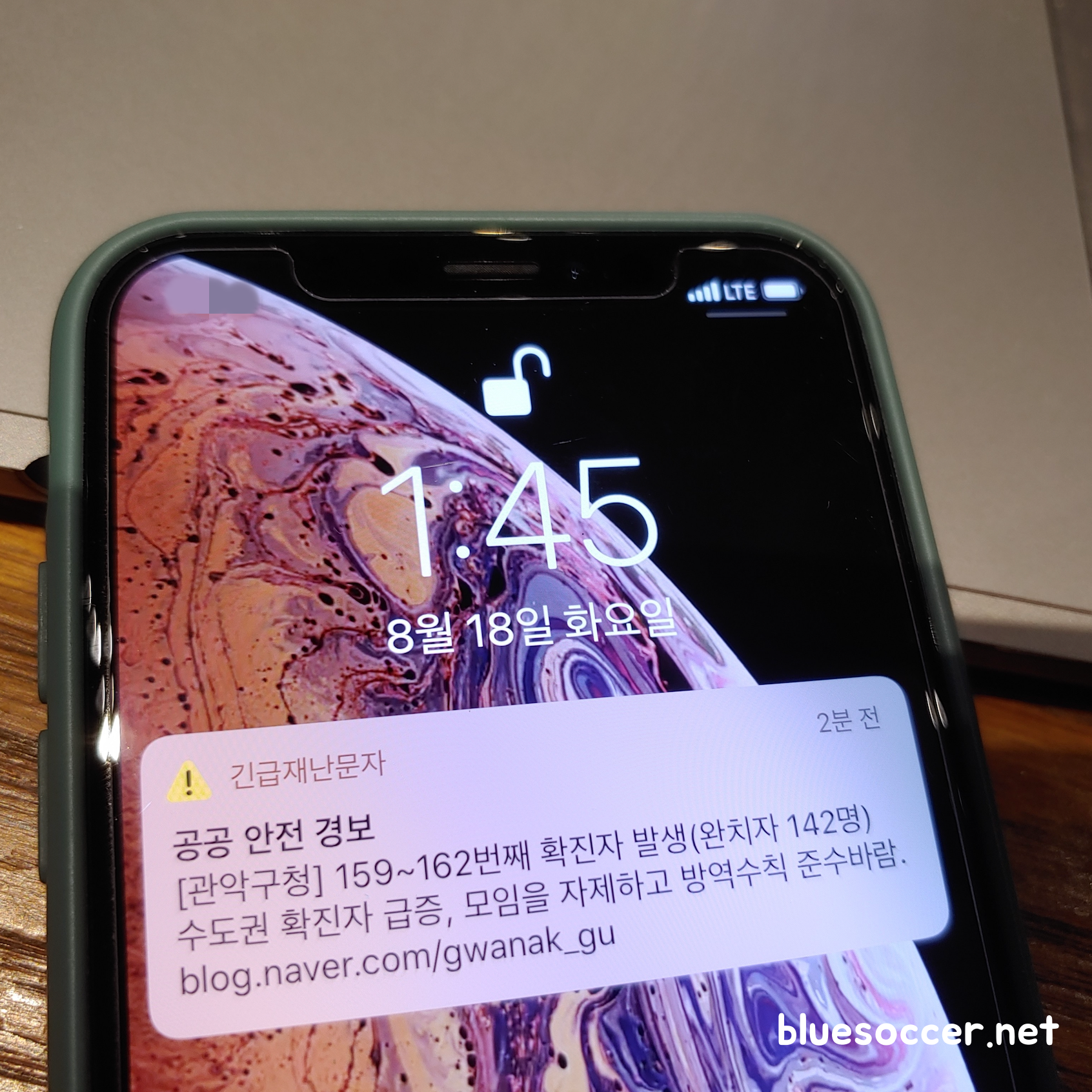[사진 = 8월 18일 화요일 저의 스마트폰을 통해 이러한 긴급재난문자를 받았습니다. 수도권 확진자가 많이 나오는 상황입니다. (C) 나이스블루]