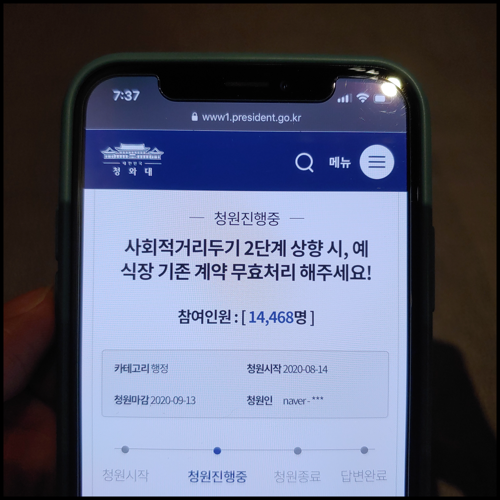 [사진 = 청와대 국민청원 공식 홈페이지에서는 사회적 거리두기 2단계 예식장 기존 계약 무효처리 원하는 청원이 1만 4천여 명 참여했습니다. 그와 더불어 예식장 위약금 보장해달라는 청원(약 3천 4백 명) 또한 참여한 사람이 꽤 있습니다. 이는 사회적 거리두기 2단계 결혼식 인원 제한 있음을 알 수 있습니다. 실내 50인 이상, 실외 100인 이상일 경우 금지되기 때문입니다. 이러한 조치로 인하여 예식장 위약금 보장 원하는 목소리가 청와대 국민청원에 올라오는 게시물을 통해 제기됐습니다. (C) 청와대 국민청원 공식 홈페이지]
