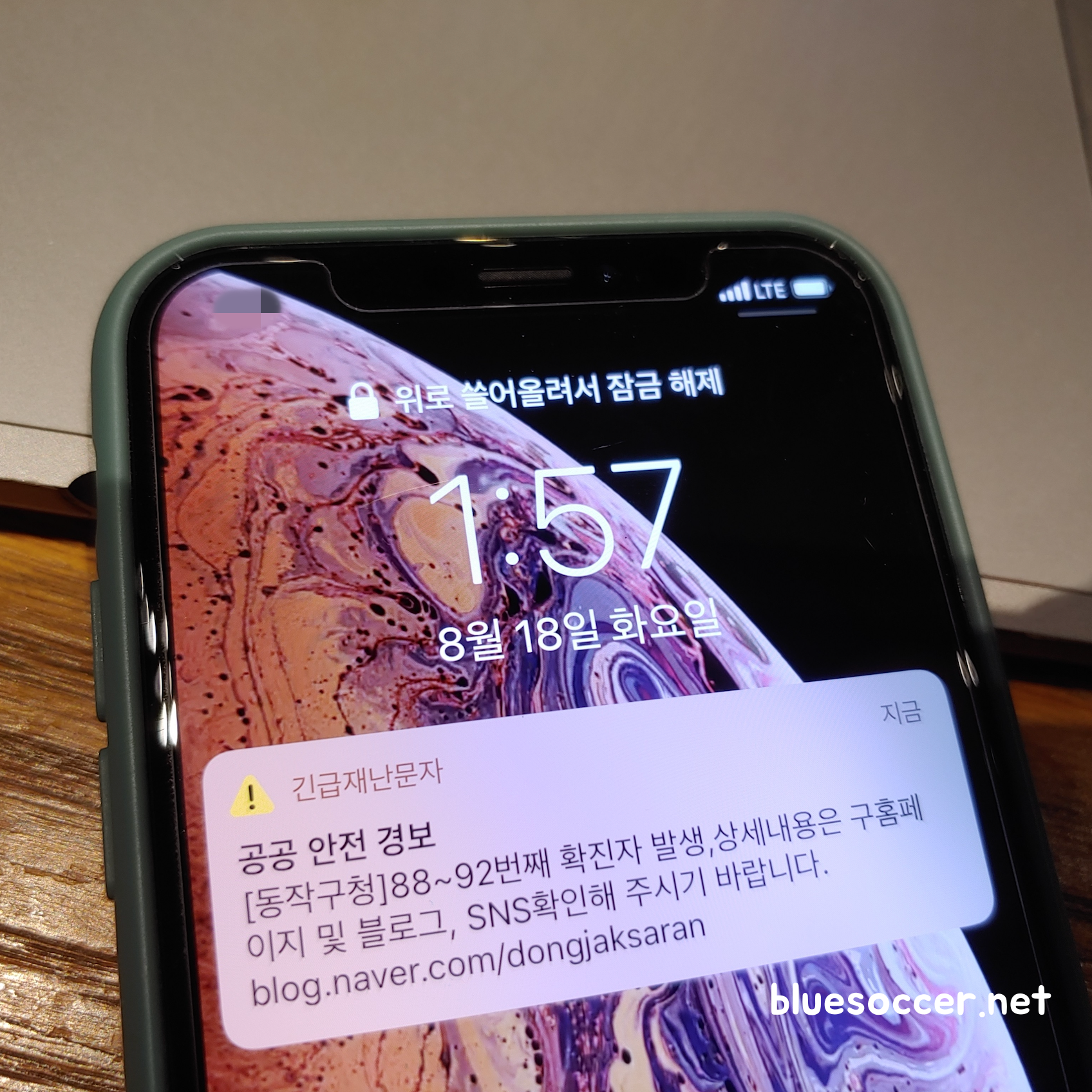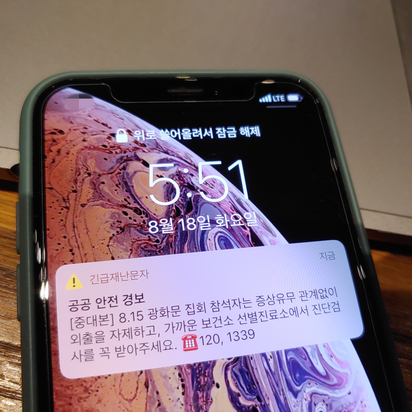 [사진 = 8월 18일 화요일 저의 스마트폰을 통해 이러한 긴급재난문자를 받았습니다. 수도권 확진자가 많이 나오는 상황입니다. (C) 나이스블루]