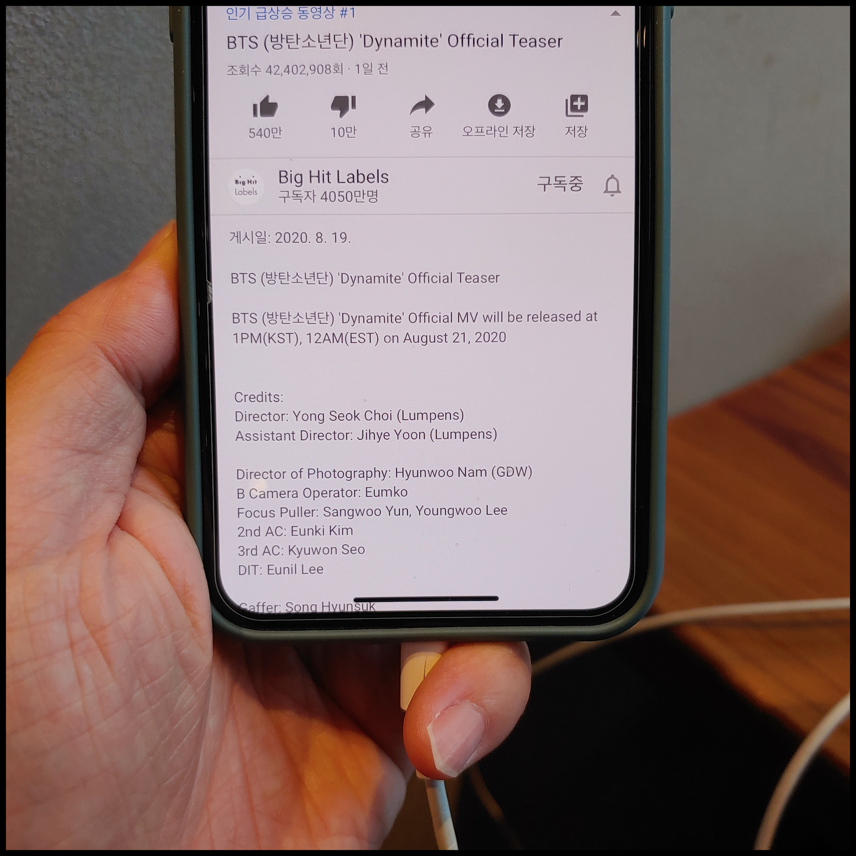 [사진 = 방탄소년단은 오는 21일 Dynamite(다이너마이트)라는 새로운 디지털 싱글로 컴백할 예정입니다. 이번 싱글은 영어로 노래합니다. 영어권 공략을 위해 영어 노래를 선보인 것으로 보입니다. 최근 유튜브에서는 방탄소년단 Dynamite 티져 영상이 한국 인기 급상승 동영상 1위를 기록했습니다. 유튜브에 업로드된지 하루 만에 조회 수 약 4,200만 회 기록할 정도로 국제적인 관심이 큽니다. 지난 앨범 타이틀곡이었던 ON이 빌보드 핫100 4위, 앨범으로서 빌보드 200 통산 4번째 1위 달성했던 전레를 떠올리면 영어 노래로 나오는 Dynamite는 빌보드에서 어떤 성과를 나타낼지, 영어권에서 방탄소년단 노래가 얼마나 열광적인 호응을 얻을지 주목됩니다. (C) Big Hit Labels 유튜브 채널]